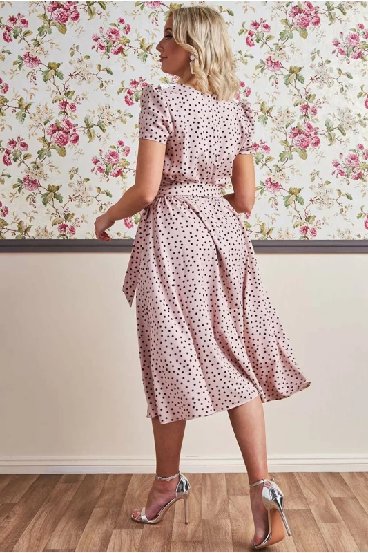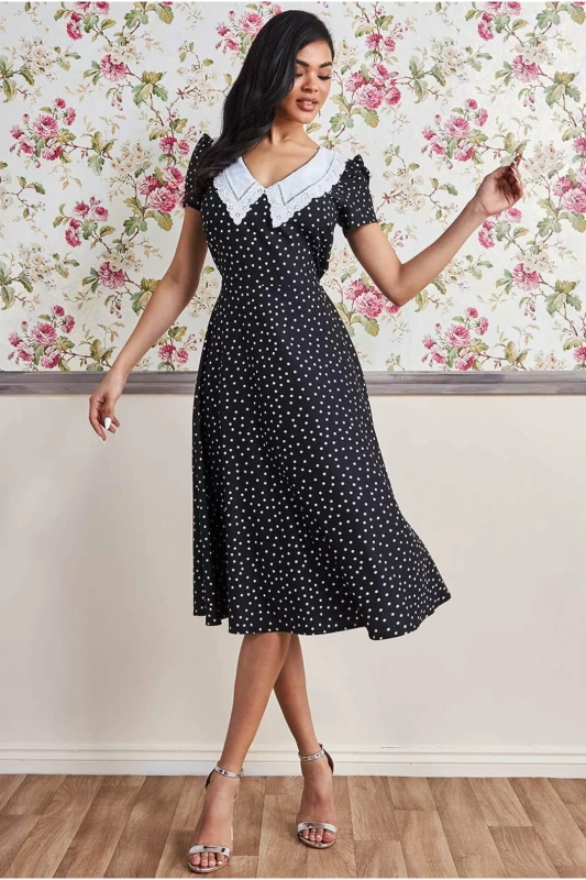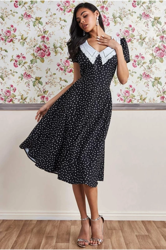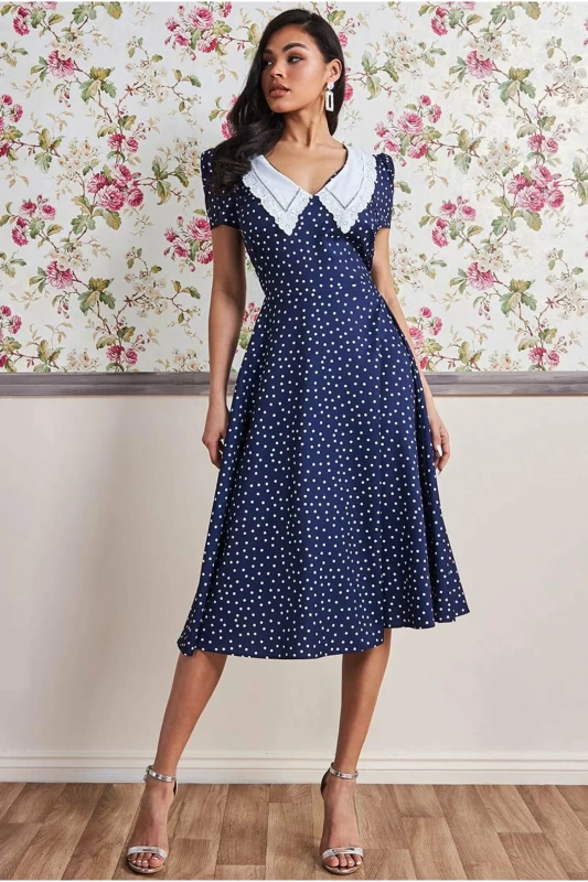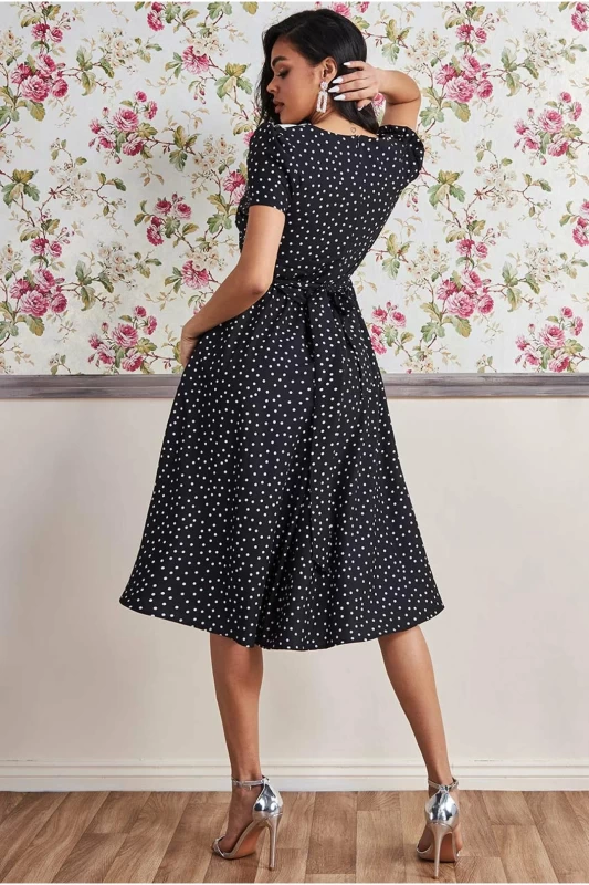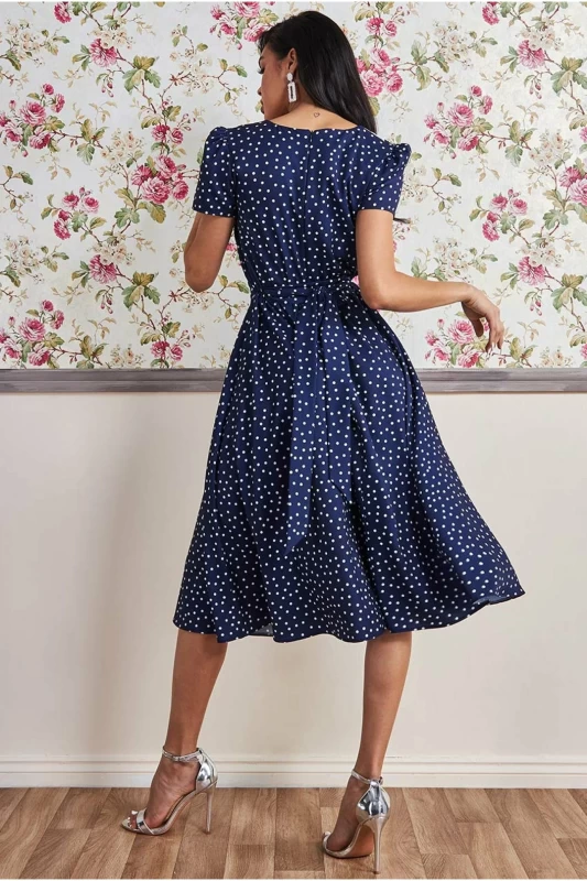 The V-neckline of this tea dress flatters the neckline and adds a touch of sophistication to the overall look. It creates a graceful and feminine silhouette, perfect for both casual and dressier occasions. The V-neckline also allows for showcasing delicate jewelry and accessories, enhancing the overall style.