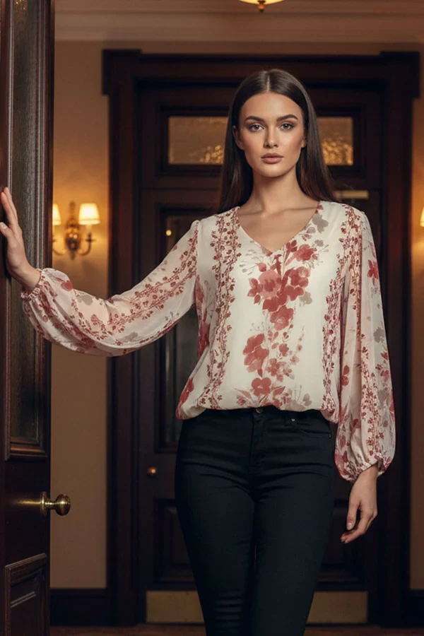 This elegant Italian polyester top features a beautiful cluster flower print with an overall floral and botanical motif that adds timeless charm. Designed with vertical floral trails and free-flowing floral clusters, it creates a visually flattering and elongating effect. Made from a lightweight, soft, and comfortable fabric, it is ideal for all-day wear across seasons. The V-neckline enhances the feminine appeal, while the long sleeves offer a slightly relaxed volume with softly gathered, elasticated cuffs for added comfort. A loose, relaxed fit makes this top perfect for plus-size styling, allowing ease of movement without compromising elegance. The elasticated hemline gently shapes the silhouette, and the pull-on style ensures effortless wear. Suitable for autumn and winter, it layers beautifully under coats and shawls, while remaining wearable during spring. Perfect for casual wear, evening outings, formal occasions, traditional gatherings, and travelling.