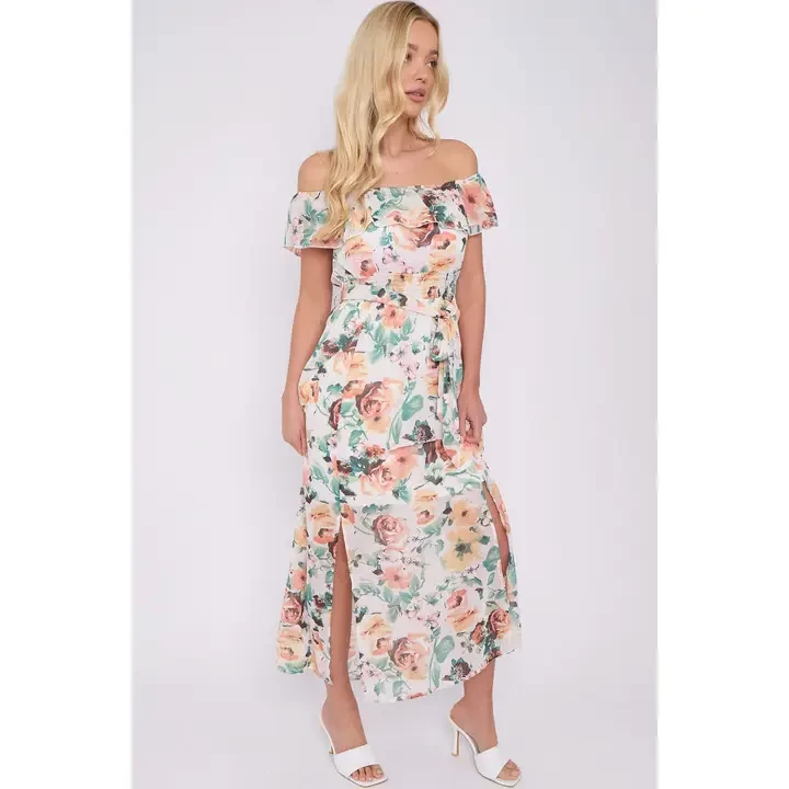 The Cream Rose Floral Print Chiffon Bardot Maxi Dress is a stunning and elegant piece featuring a delicate rose floral print on lightweight chiffon fabric. Designed with an off-the-shoulder Bardot neckline and a flowing maxi length, this dress exudes timeless charm and sophistication. Perfect for a variety of occasions, it is ideal for garden parties, weddings, or romantic outings. Pair it with sandals for a relaxed look or dress it up with heels for a more refined ensemble.
