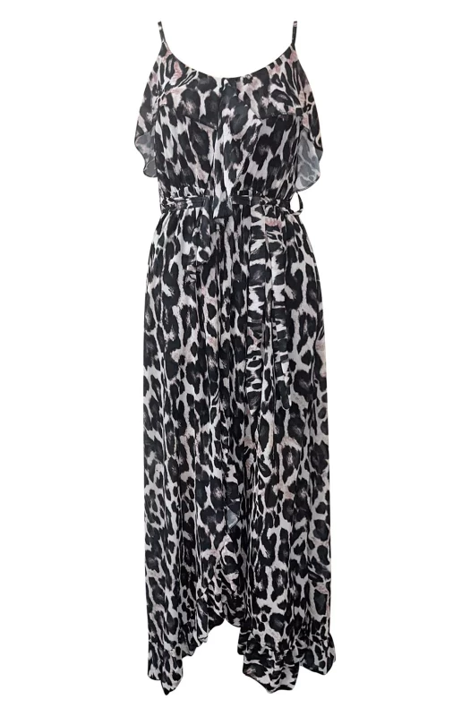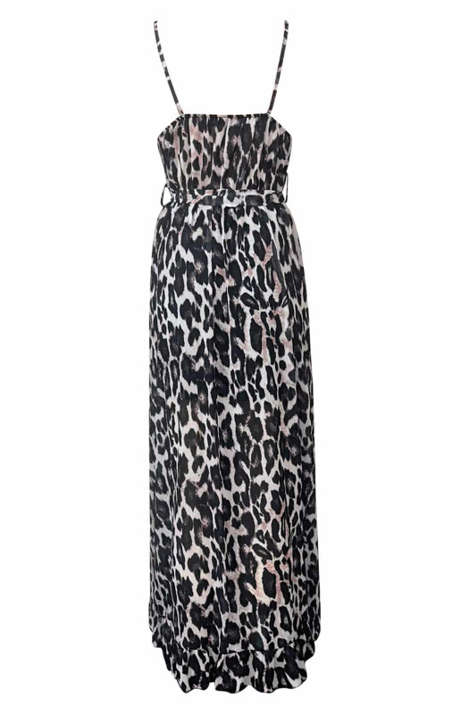 Elevate your summer wardrobe with our eye-catching Diane animal Wrap Frill Chiffon Maxi Dress. This stylish dress features a delicate all-over wild and edgy animal print and a thin strappy camisole design with a flattering 'V' neckline. The overlay frill and elasticated waistband creates a flowy silhouette, while the open front wrap detail and fabric belt add a touch of elegance. The soft chiffon material is paired with a short lining underneath for comfort and the perfect fit. Available in approx. sizes of: S (UK 8), M (UK 10), and L (UK 12) with an approx. length of: 47"(120cm) from the side seam. Made in Italy from 100% Polyester, 95% Viscose, and 5% Elastane. Upgrade your summer look with this must-have dress!