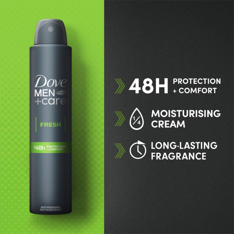 Dove Men+Care Fresh 48Hr Protection and Comfort Anti-Perspirant Deodorant Body Spray 150 ml provides long-lasting protection against sweat and odour while keeping underarms comfortable and moisturised for up to 48 hours; its advanced formula is specially designed for men’s skin, helping to prevent irritation and dryness even with daily use. The fresh, invigorating scent combines subtle citrus and clean aromatic notes to leave you feeling energised and confident throughout the day. Quick-drying and non-sticky, the spray applies evenly without leaving white marks on clothing, ensuring a clean, hassle-free experience. Its compact 150 ml size makes it convenient for home, gym, or travel use. The antiperspirant action helps reduce wetness while controlling odour, supporting active lifestyles and long workdays alike. Gentle yet effective, it is suitable for sensitive skin and daily application, providing consistent performance. The ergonomic can ensures easy handling and precise, mess-free application every time. Works seamlessly alongside body washes, colognes, and grooming routines for a layered fragrance experience. Helps maintain underarm skin health with Dove’s signature moisturising technology. Lightweight formula provides comfort without compromising strength or protection. Leaves you feeling refreshed, confident, and ready for any activity. Enhances your daily grooming routine with dependable antiperspirant performance. Dermatologically tested for safety and reliability on men’s skin. Dove Men+Care Fresh 48Hr Protection and Comfort Body Spray combines long-lasting freshness, gentle care, and invigorating fragrance in one essential product.