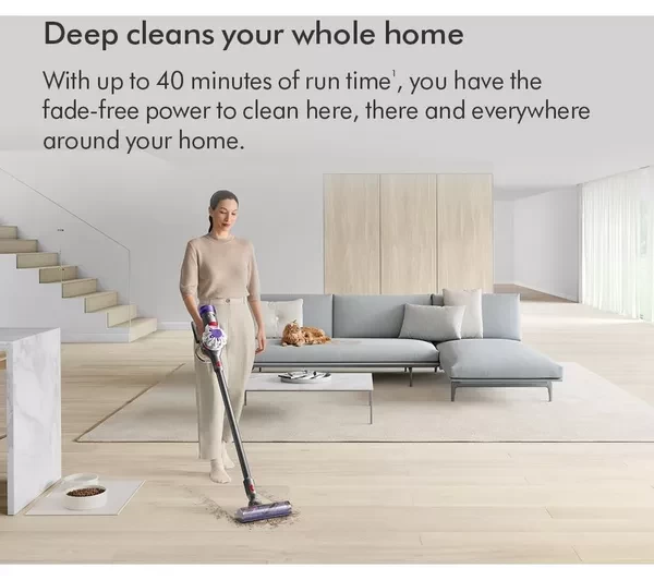 This cordless Dyson V8 gives you up to 40 minutes of fade-free suction - zip from room to room without any annoying cables getting in your way. Ground in dirt can be stubborn, but it's no match for the powerful Dyson digital motor. It's been designed to run nice and quietly without compromising on performance. The Detangling Motorbar lifts long hair and pet hair from your floors, and it's specially-designed vanes mean you won't need to unclog it as you're cleaning. It's a life saver if you have furry friends in the house.