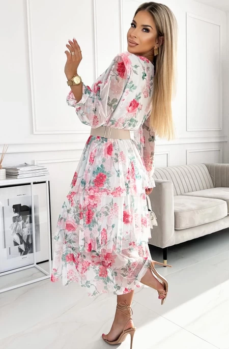 Be the star of any summer party in this stunning floral chiffon tiered maxi dress! Available in a variety of colors and patterns. This dress features a front low cut 'V' wrap neckline and an elasticated waistband for a comfortable and flattering fit. The long see through sleeves with elasticated frill cuffs adds a touch of elegance, while the tiered frill style with the added fabric belt fastening detail, creates a beautiful silhouette. With its soft and stretchy fabric and added lining underneath, this dress is both stylish and comfortable. Available in approx. sizes of: S (UK 8) M (UK 10) L (UK 12) and XL (UK 14) with an approx. length of: 52"(132cm). Made in Italy from 100% Polyester and 95% Viscose, 5% Elastane. This dress is sure to make a statement and is a must-have for any fashion-forward wardrobe.