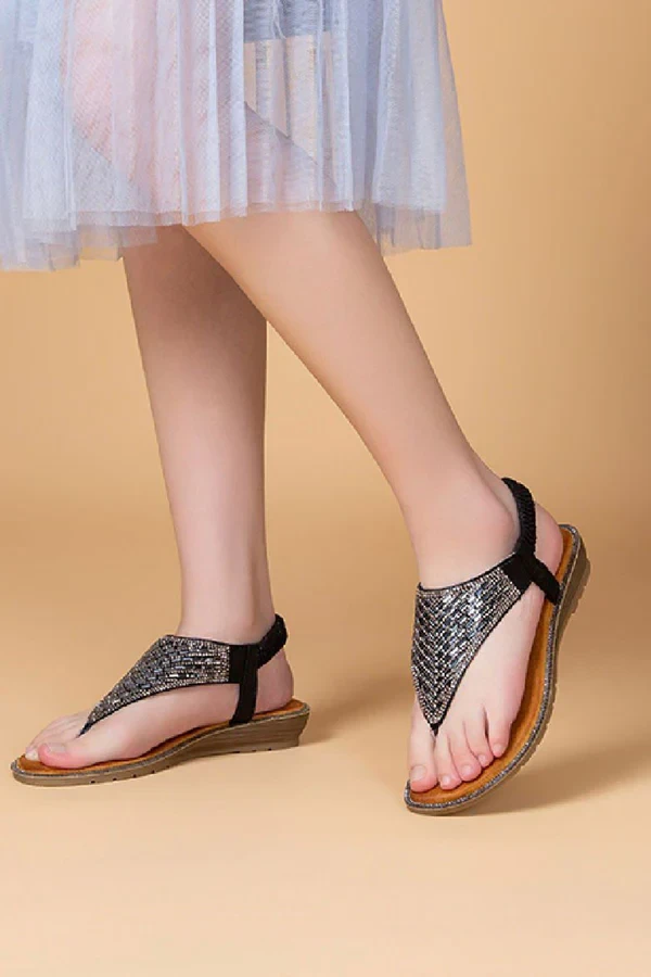 Elevate your everyday look with these eye-catching black slingback sandals, designed to blend fashion with function. The front strap showcases a woven design lavishly adorned with black and silver embellishments for a chic, modern finish. Crafted for comfort, the sandals feature a gently elevated low wedge sole and a padded insole that supports your feet throughout the day. The elasticated slingback strap allows for a snug and flexible fit, making them a breeze to slip on and off. Ideal for warm-weather wear, these lightweight sandals are a go-to for holidays, garden parties, or casual brunch dates.