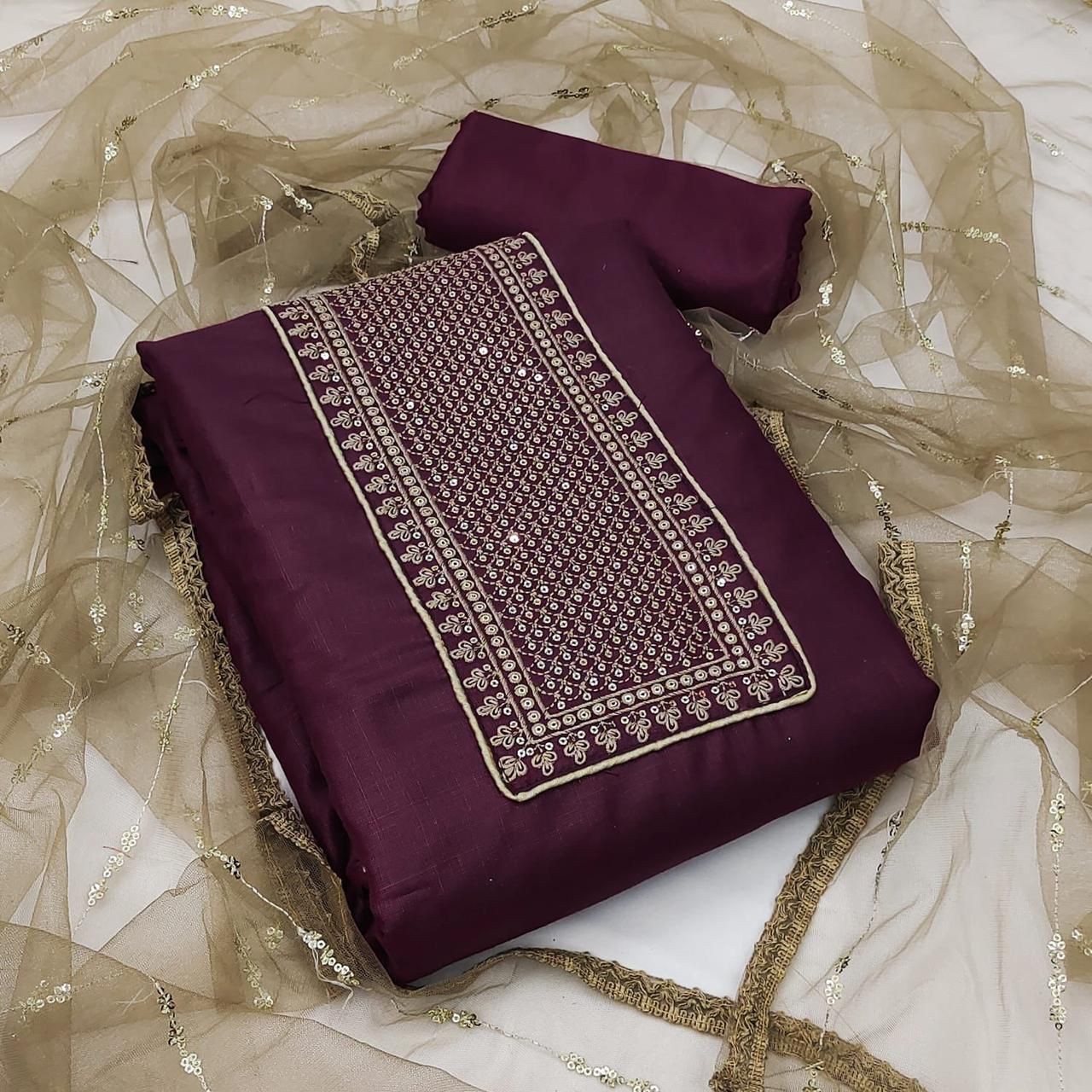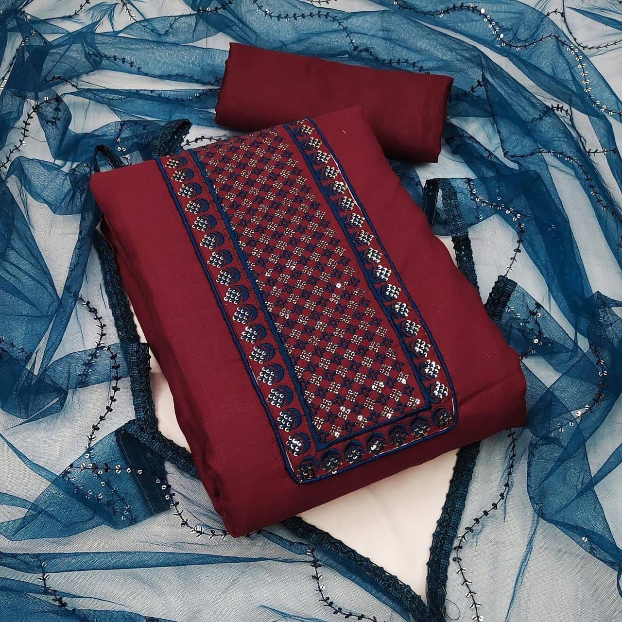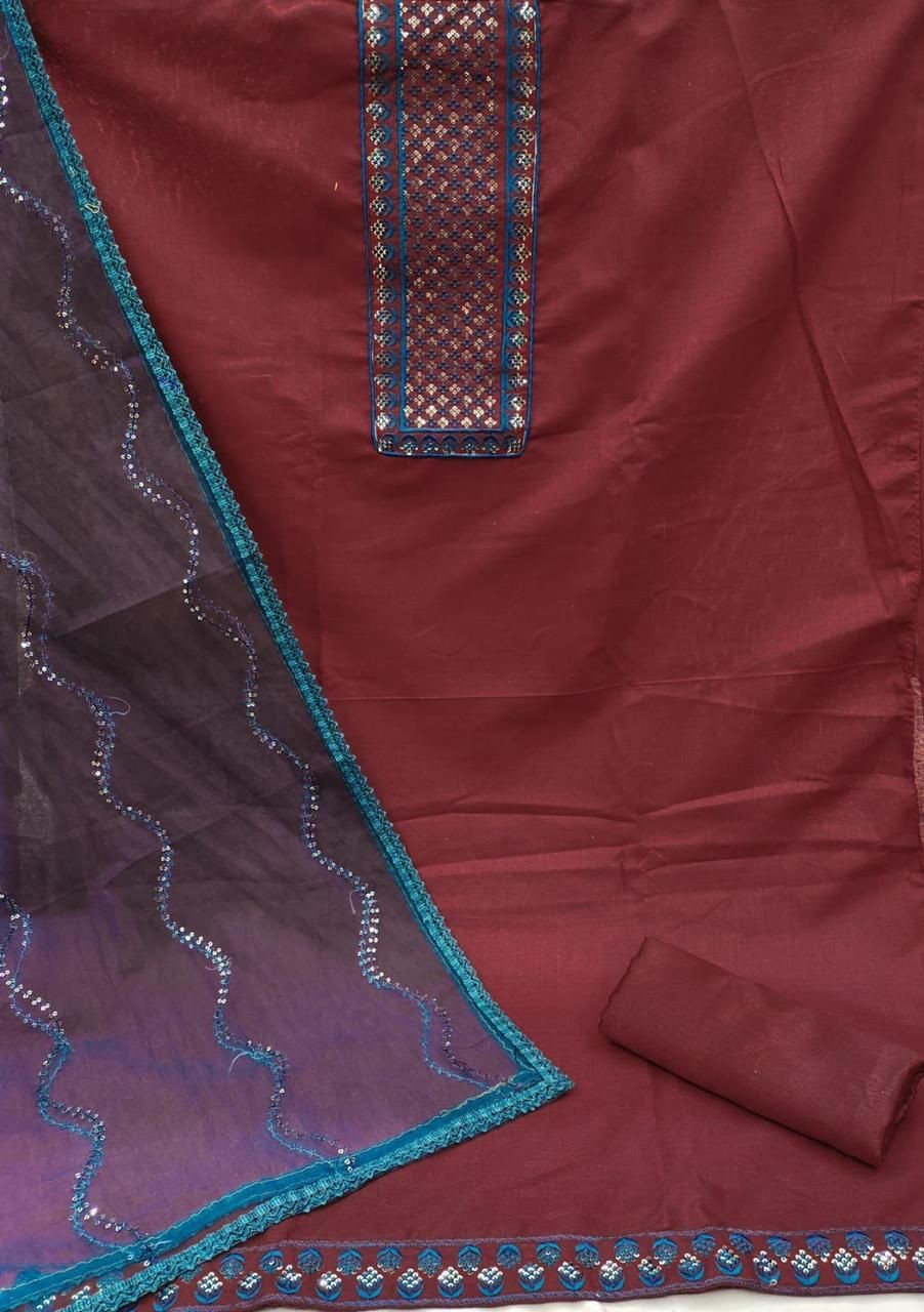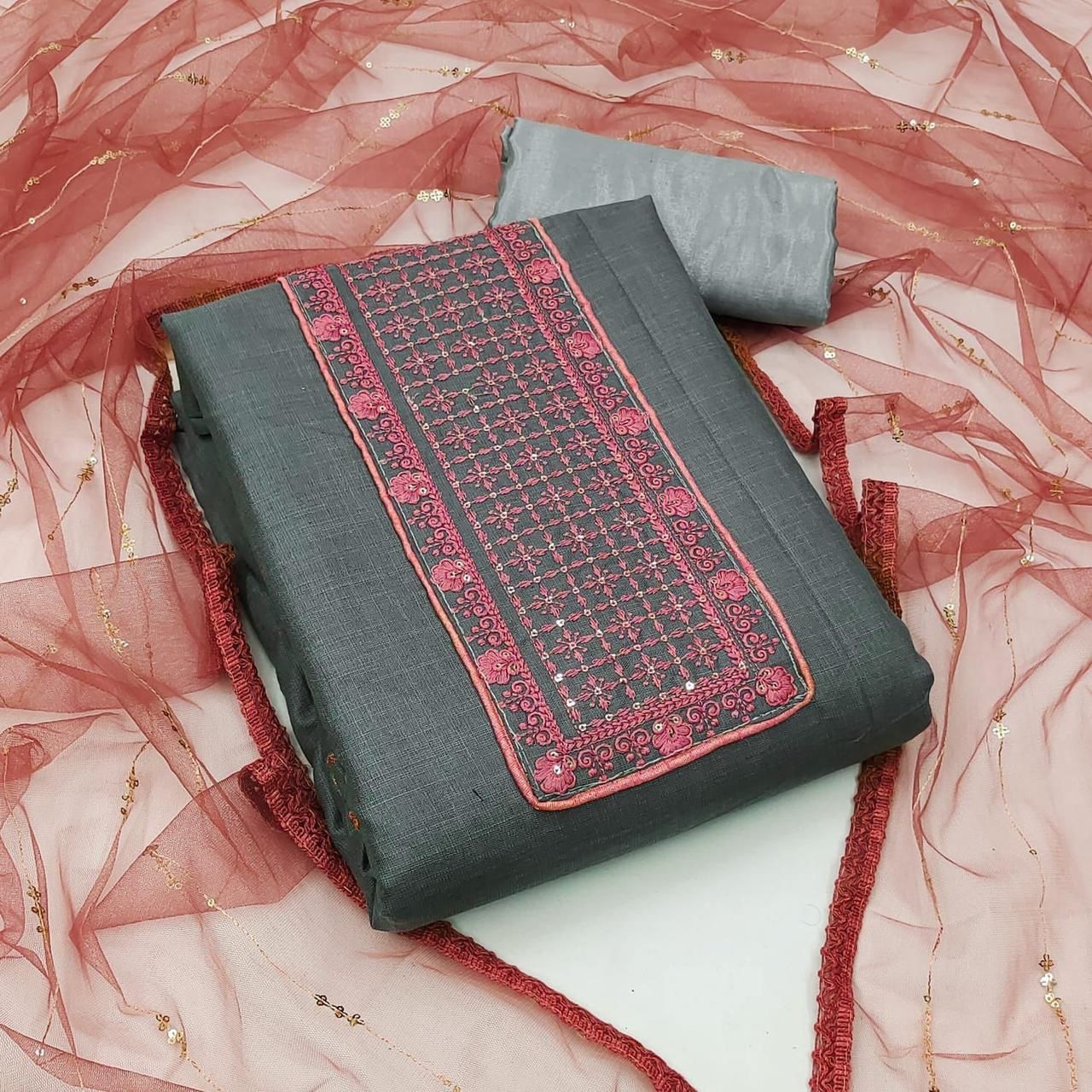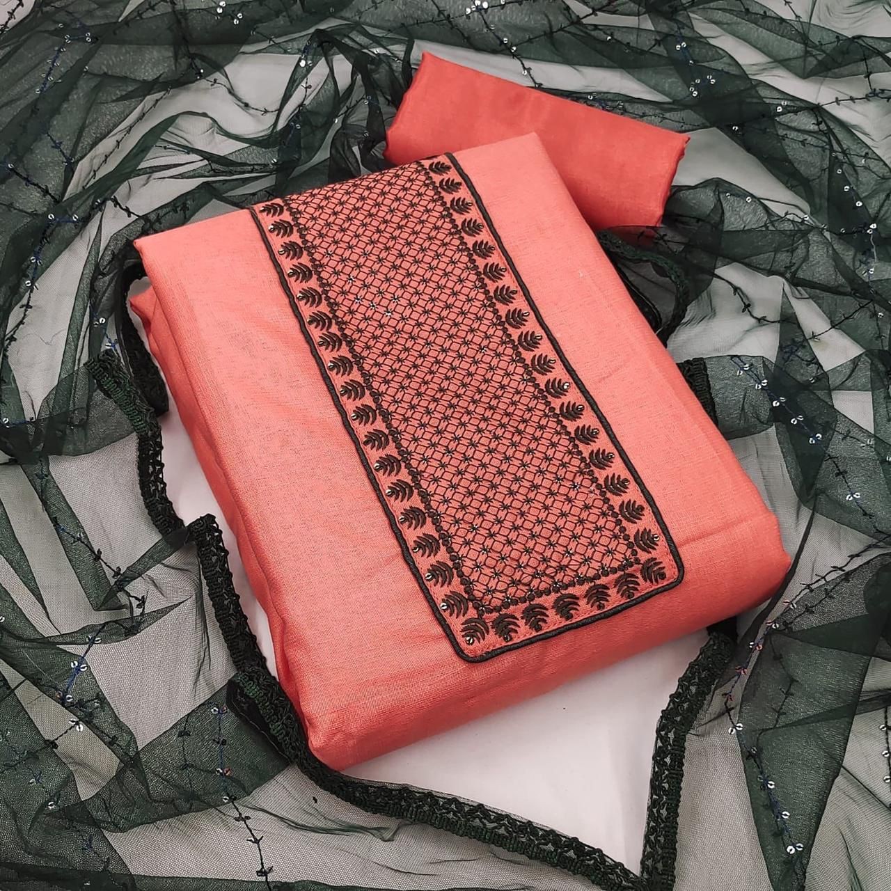 Top Fabrics:- SLUB COTTON (SEQUENCE WORK)Bottom Fabrics:- PURE SANTONDupatta:MONO SQUARE NET SEQUENCE WORKSize:Metrial