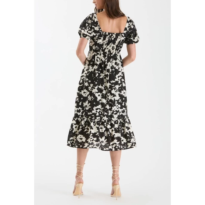 SQUARE NECKLINE SHORT PUFF SLEEVES PLEATED BUST BACK SMOCKING FLORAL PRINT MIDI DRESS LINED SHELL: 80%RAYON 20%NYLON LINING: 100%POLYESTER