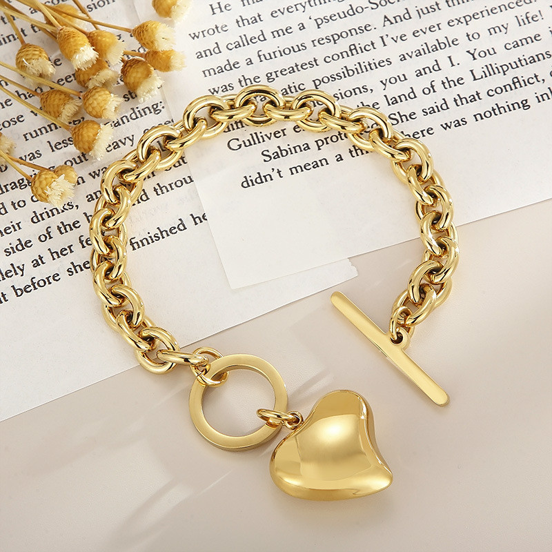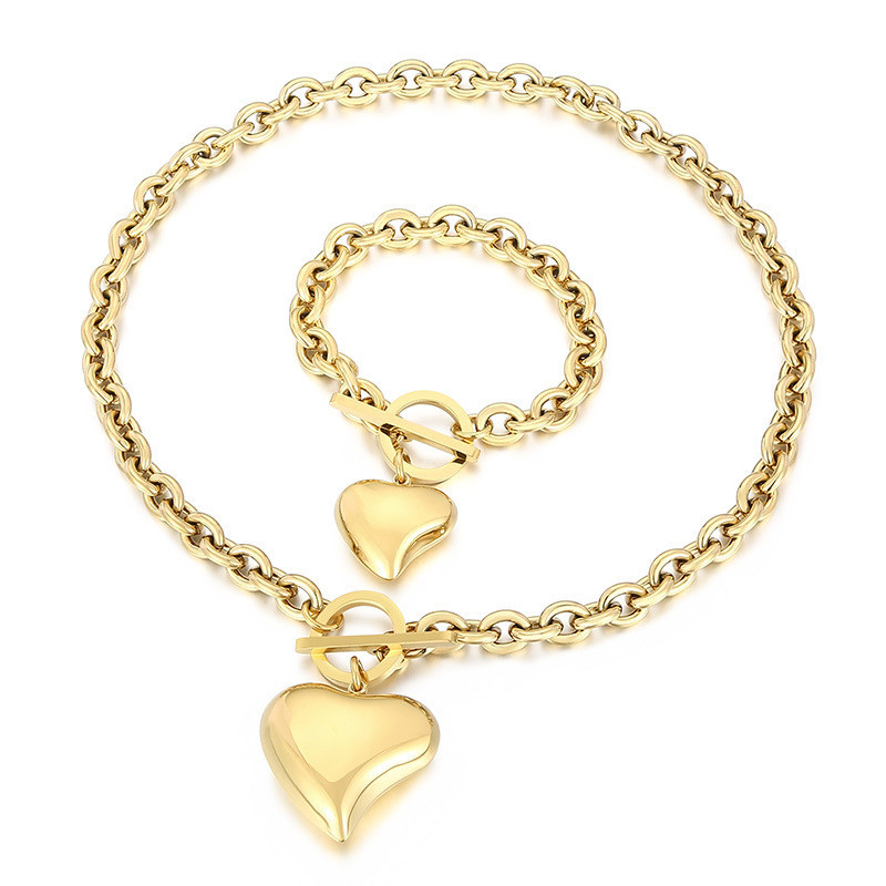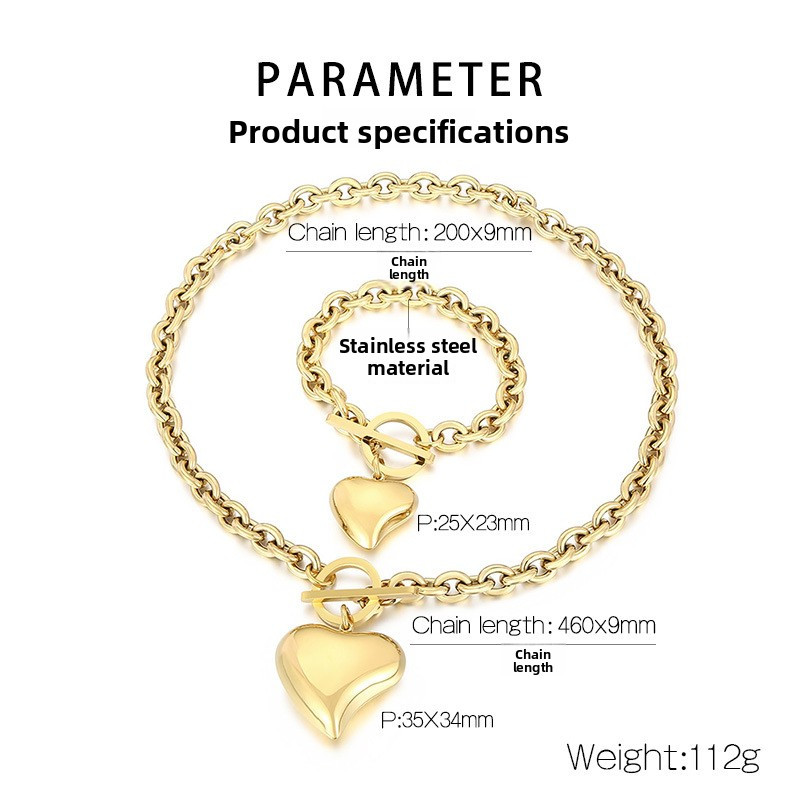The Fashion Geometric Titanium Steel 18K Gold Plated Stainless Steel Bracelet & Necklace Set Gold is a beautifully coordinated jewelry set designed for women who appreciate elegance and modern style. Classified as a complete set, it includes both a matching necklace and bracelet for a perfectly balanced look. Crafted from high-quality stainless steel, it offers excellent durability and long-lasting shine. The pendant elements are made from strong titanium steel, ensuring resilience and a premium finish. Enhanced with rich 18K gold plating through advanced electroplating craft, the set radiates a luxurious golden glow. Its minimalist yet expressive design makes it ideal for stylish commutes, office wear, and special occasions. The classic O-chain type provides a secure and comfortable fit for everyday use. Featuring elegant geometric shapes along with heart, water drop, and bell-inspired patterns, it adds a graceful feminine touch. The coordinated necklace and bracelet create a sophisticated and polished appearance. With a total weight of 20g, it feels substantial yet remains comfortable throughout the day. The smooth finish ensures skin-friendly wear without irritation. Fine detailing highlights its fashionable and contemporary appeal. Perfect for pairing with dresses, formal outfits, or casual chic styles. An excellent gift option for birthdays, anniversaries, or meaningful celebrations. This gold bracelet and necklace set combines strength, elegance, and timeless beauty in one stunning accessory collection.