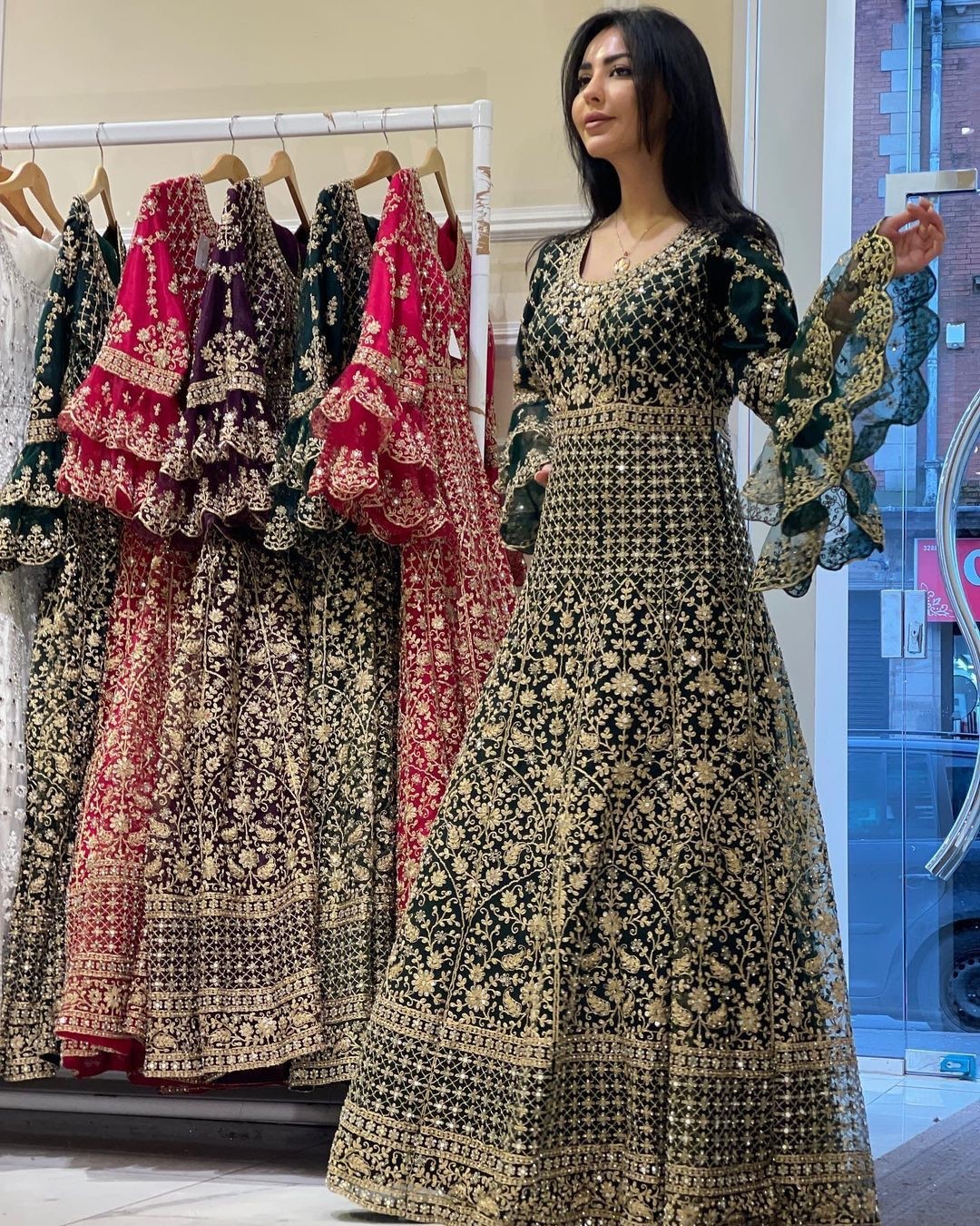 GOWN FABRIC :FAUX GEORGETTE WITH HEAVY EMBROIDERY WORK WITH DIAMONDS HAND WORK WITH FANCY RAFFLE SLEEVE