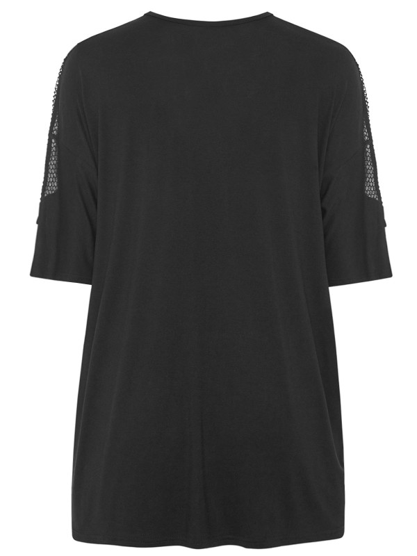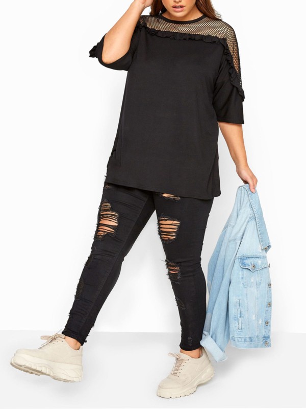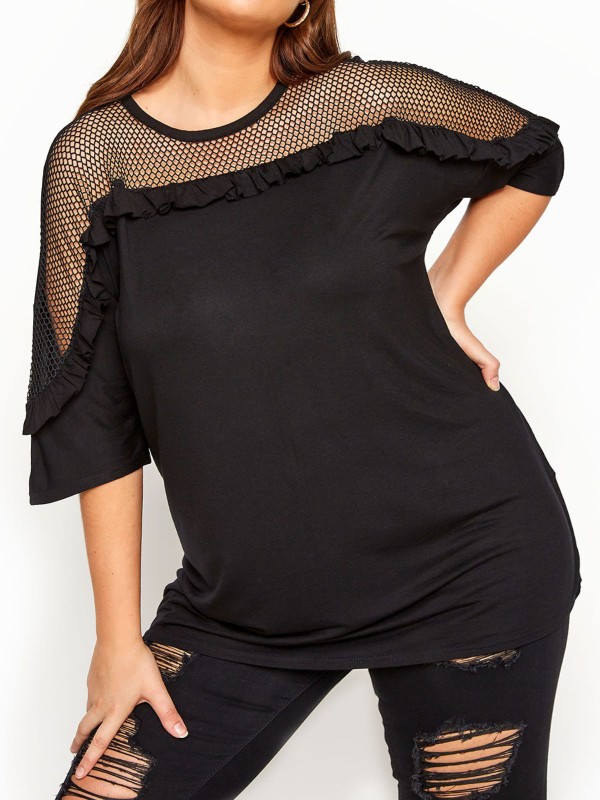 Add a touch of edge to your look with this top. With an on-trend fishnet insert, it finishes with 3/4 length sleeves, ruffle detail and a simple scoop neckline.