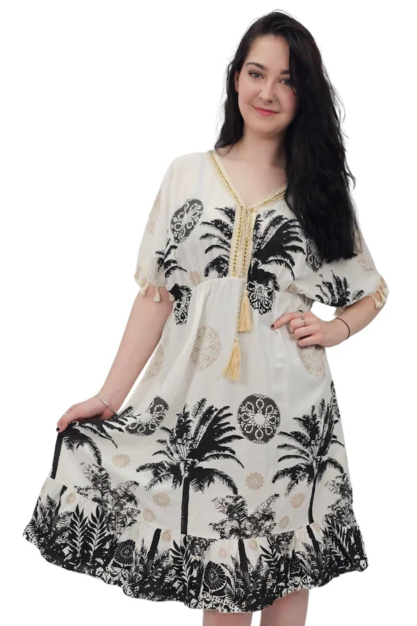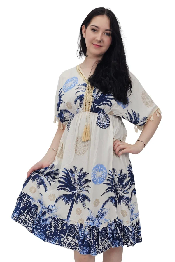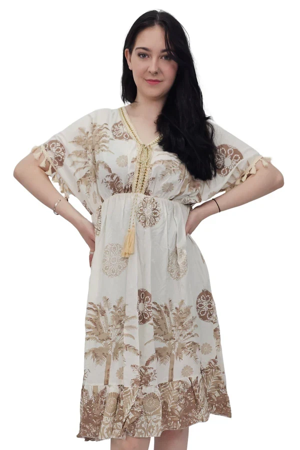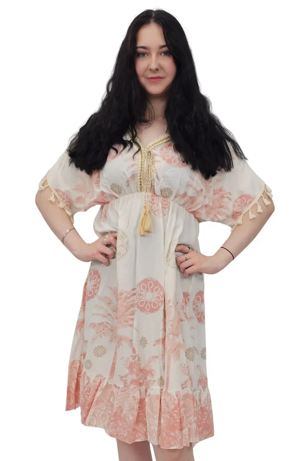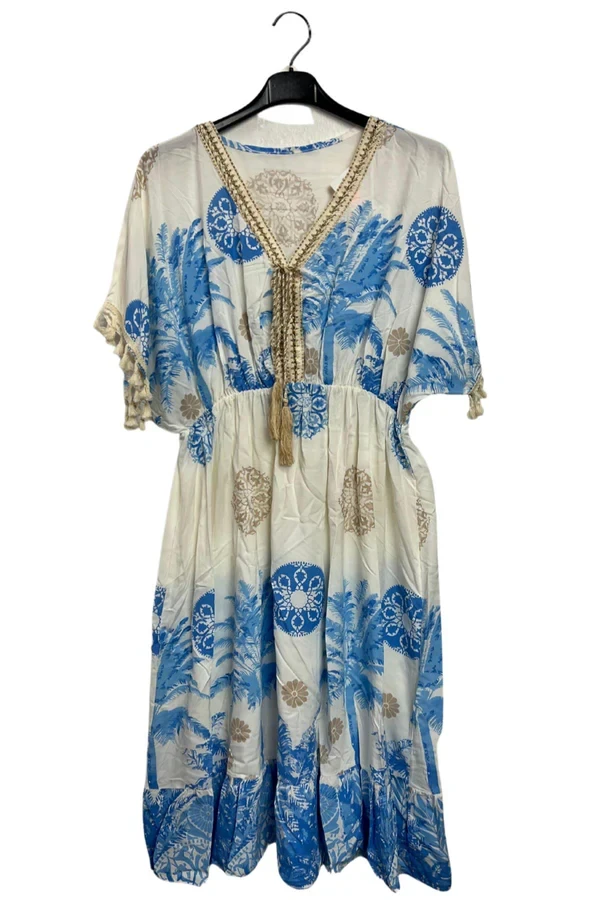 Elevate your summer style with this Italian viscose dress, designed in a breezy bohemian silhouette adorned with a lush floral botanical print. The relaxed mid-length fit drapes effortlessly, making it a flattering choice for plus-size figures. A V-neckline accented with delicate Decira tassels leads into a tie-front closure for an added touch of charm, while short puff sleeves trimmed with matching tassels echo its playful, artisanal feel. The elasticated waist defines your shape gently, offering comfort without compromising flow. A softly ruffled hem adds movement and femininity, perfect for sunny getaways or resort lounging. Crafted from lightweight fabric, this dress is a breathable beauty for spring and summer adventures. Whether you're wandering beachside markets or enjoying brunch al fresco, this dress combines comfort, elegance, and that unmistakable boho flair.