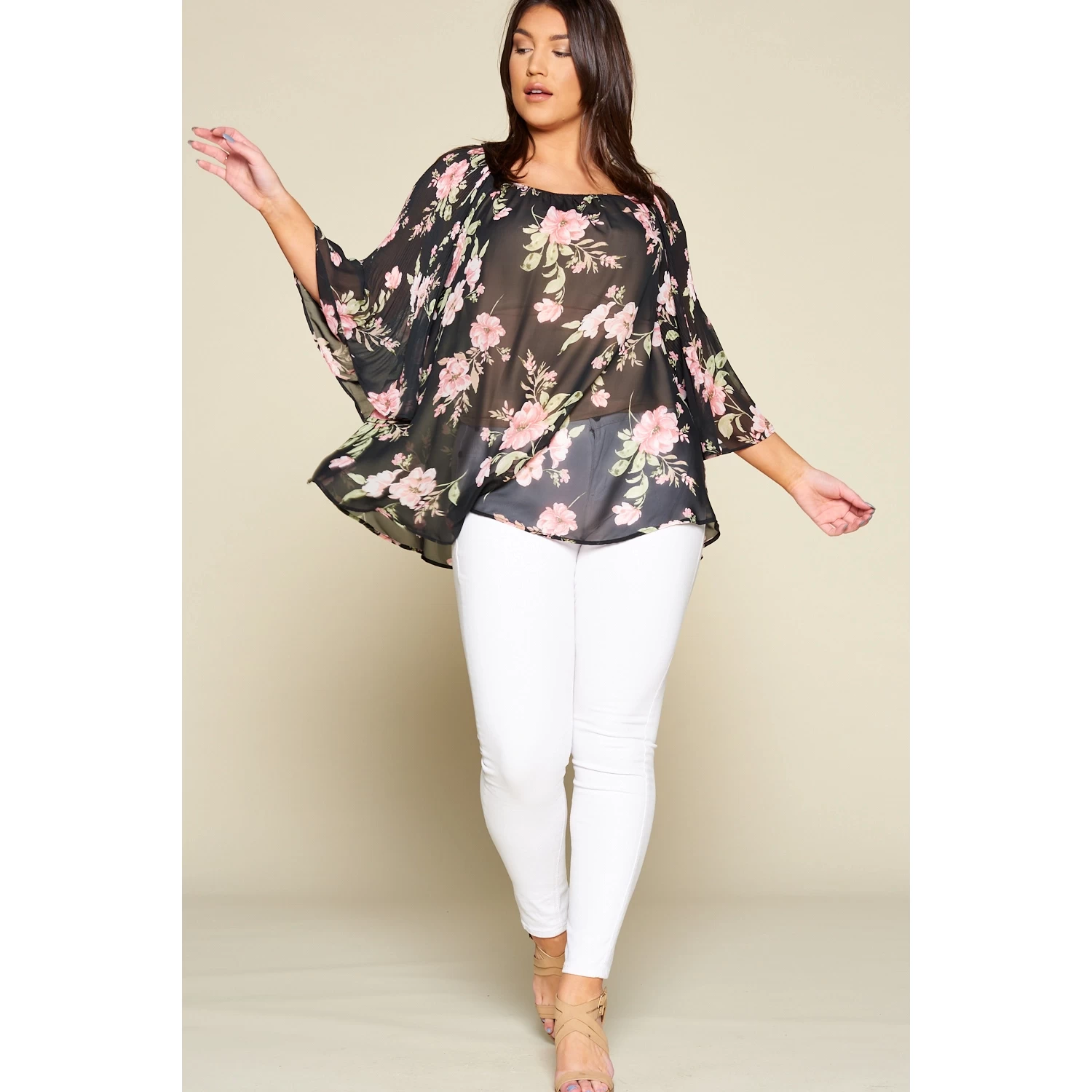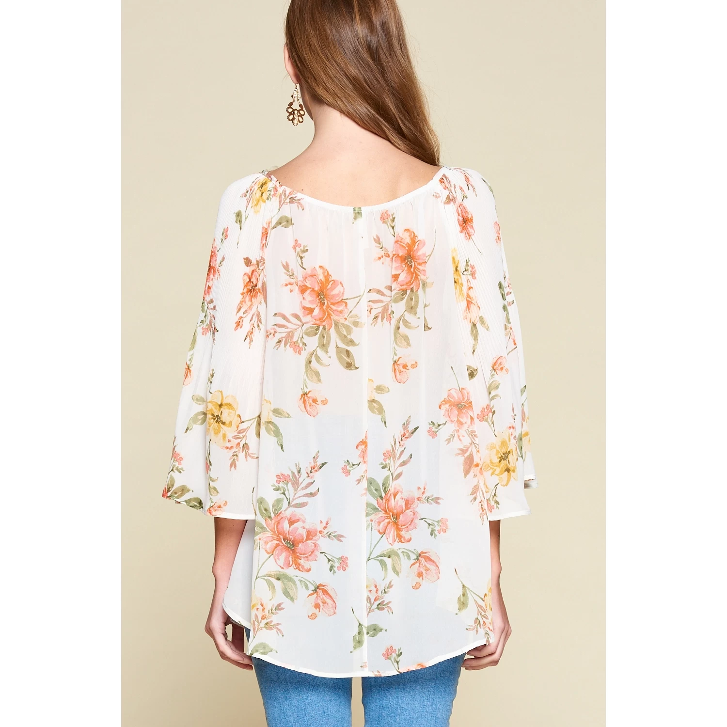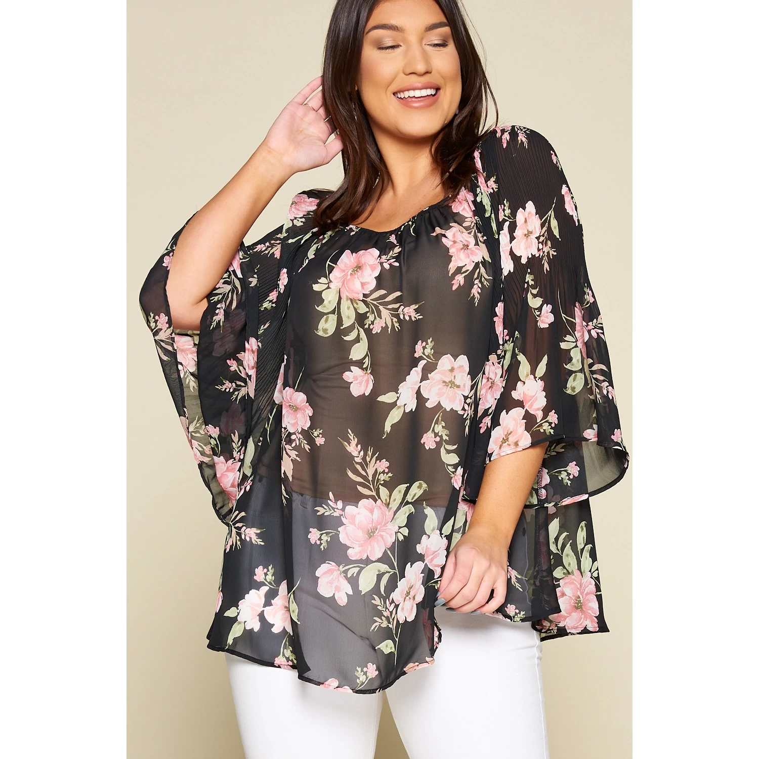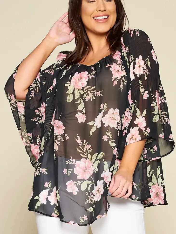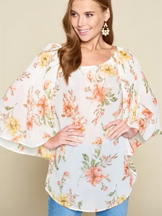 Beautiful Floral Printed Chiffon Pleated Bell Sleeves Fashion Top with Elastic Shoulder Detail, , *This top can be worn on and off shoulder* 100% Polyester