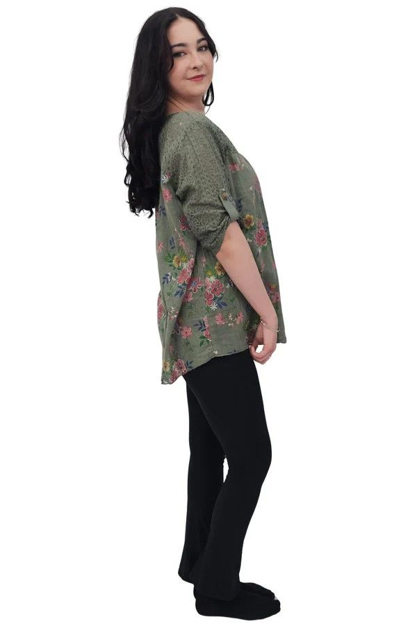 Add a touch of romance to your everyday wardrobe with this Italian cotton tunic, designed for plus-size women who adore a soft, feminine look. Featuring an elegant floral print, this top combines casual comfort with delicate beauty. The round neckline and short sleeves offer a relaxed silhouette, while intricate lace detailing graces the upper chest and shoulders, adding charm and vintage-inspired elegance. Made from breathable, lightweight cotton, it’s perfect for spring and summer days when comfort and style are key. The loose fit flatters all body types and allows for easy movement, whether you're out shopping, enjoying lunch with friends, or exploring the outdoors. The floral print and lace blend effortlessly to create a timeless boho-chic aesthetic that pairs well with jeans, leggings, or linen trousers. This Italian-crafted top is a beautiful fusion of comfort, artistry, and effortless grace.