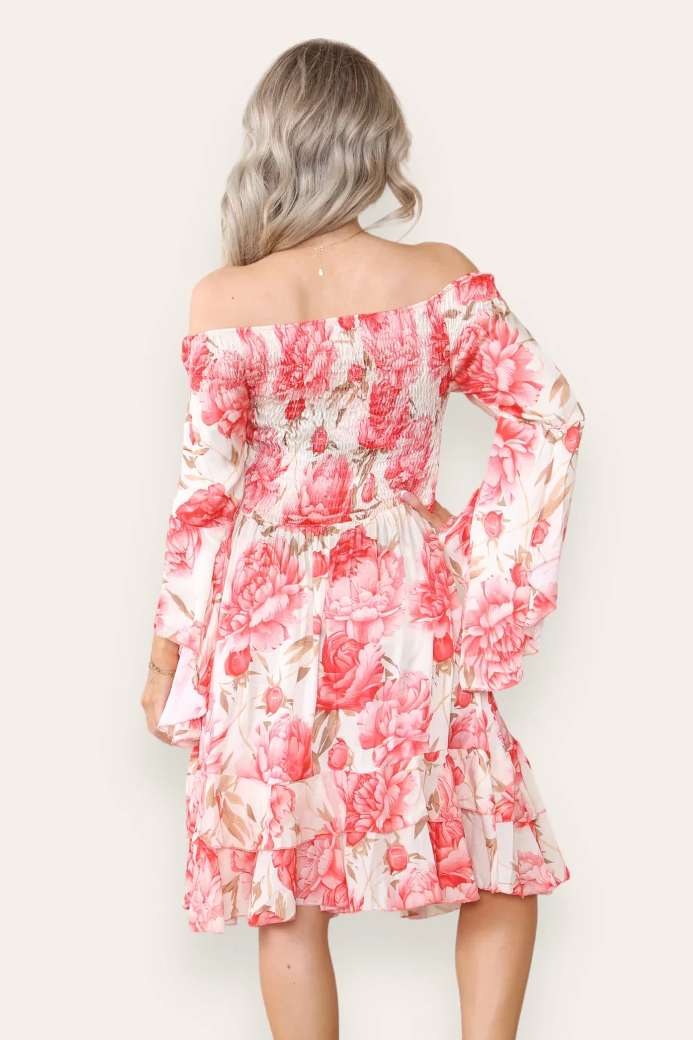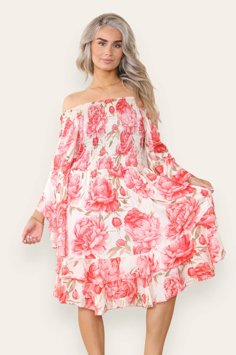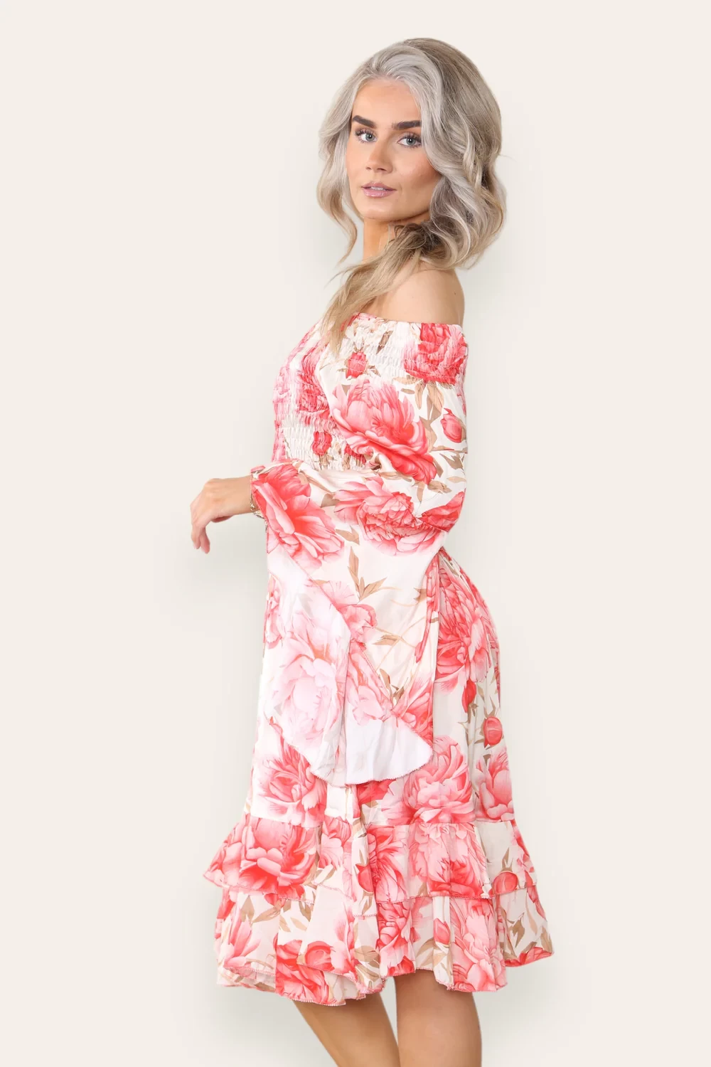 FLORAL SATIN OFF SHOULDER DRESS