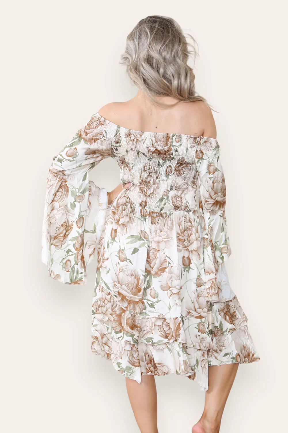 FLORAL SATIN OFF SHOULDER DRESS - BEIGE