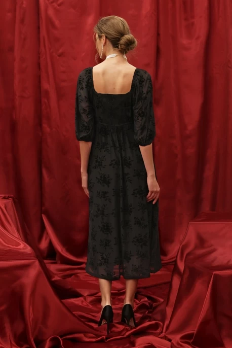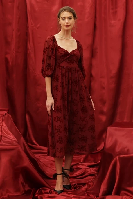 3/4 PUFF SLEEVE ELASTIC CUFF TWIST FRONT SWEETHEART NECKLINE BACK SMOCKING VELVET FLORAL PRINT LINED MIDI DRESS / MAXI DRESS SHELL: 92%POLYESTER 8% SPANDEX LINING: 100%POLYESTER