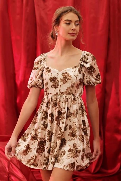 SWEETHEART NECK SHORT PUFF SLEEVE HIGH WAIST MINI DRESS VELVET FLORAL LINED SHELL: 100% POLYESTER LINING : 100% POLYESTER