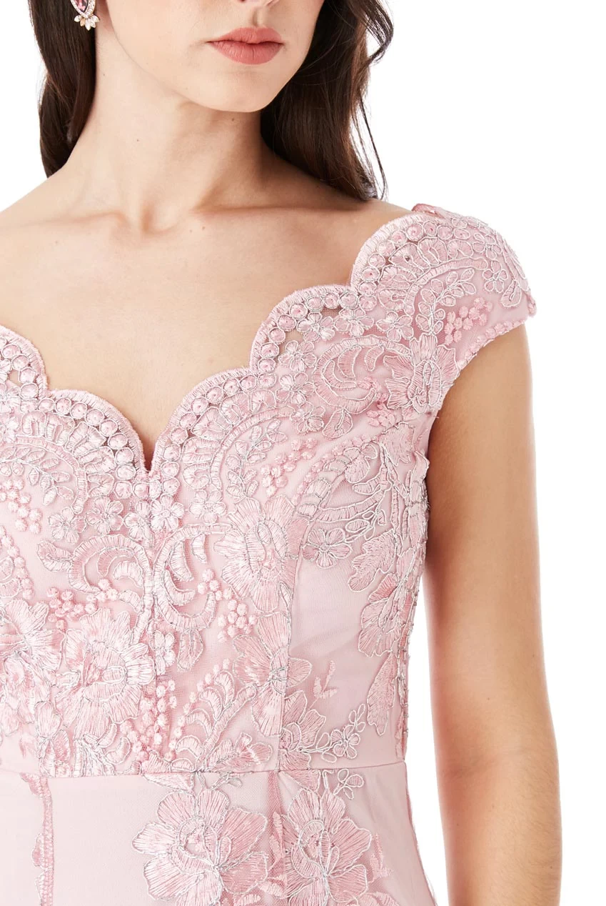 GODDIVA EMBROIDERED LACE MIDI DRESS WITH ASYMMETRICAL HEM