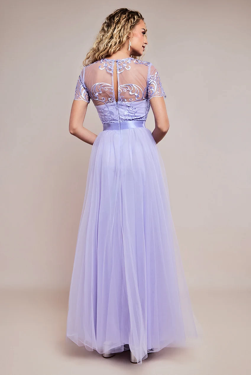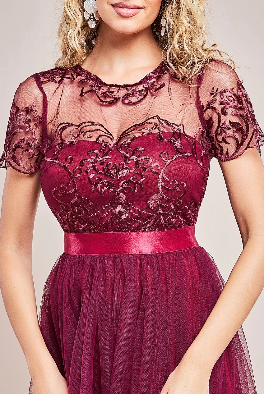 for any special occasion. Its maxi length, short sleeves, embroidered mesh,