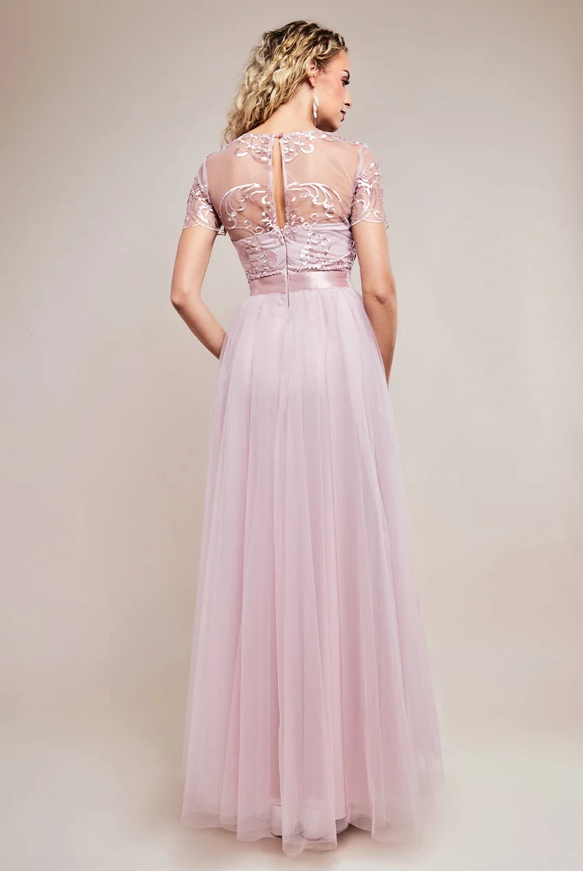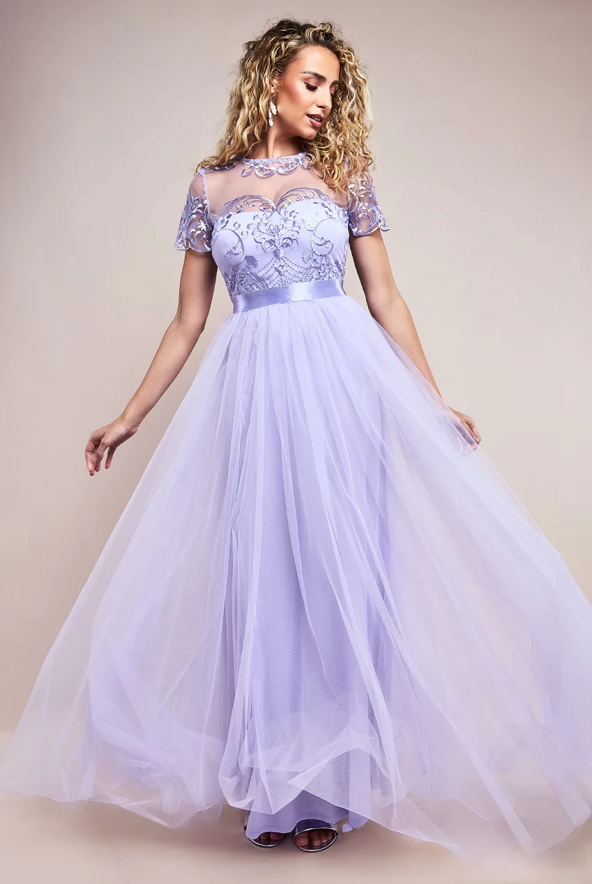 Embroidered Bodice Mesh Maxi Dress, the ultimate dress for any special occasion.