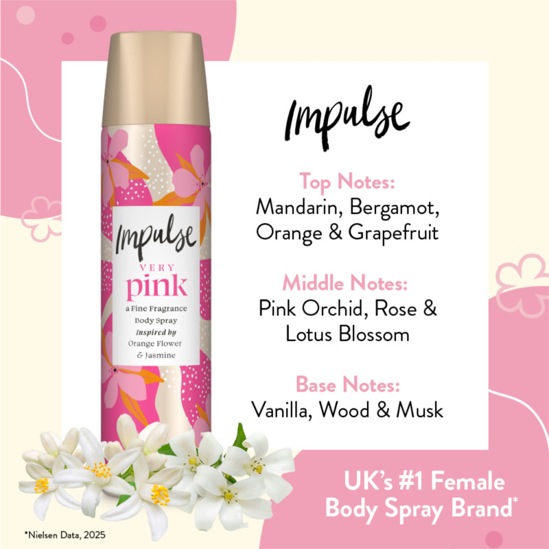 Impulse Very Pink Women’s Body Spray with Orange Flower and Jasmine scent is a vibrant and playful fragrance designed to energize your day. It opens with fresh citrusy notes that instantly feel bright and uplifting. The heart reveals delicate orange flower blended with soft jasmine for a feminine floral touch. This lively combination creates a sweet yet refreshing aroma. The fragrance feels youthful, cheerful, and confident. Its lightweight mist is gentle on the skin and comfortable for daily wear. Perfect for quick freshness anytime, anywhere. Ideal for work, outings, or casual evenings. The scent leaves a soft, lingering trail without being overpowering. Compact 75ml size makes it easy to carry in your bag. Suitable for all skin types. Adds an instant boost of freshness and charm. Designed for women who love fun and colorful fragrances. Keeps you feeling fresh and confident throughout the day. Impulse Very Pink is perfect for expressing your bright and lively personality.