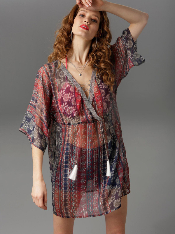 Complete with dramatic wide sleeves, a tassel tie neckline, this enchanting tunic ticks all the boxes! Length 35in.