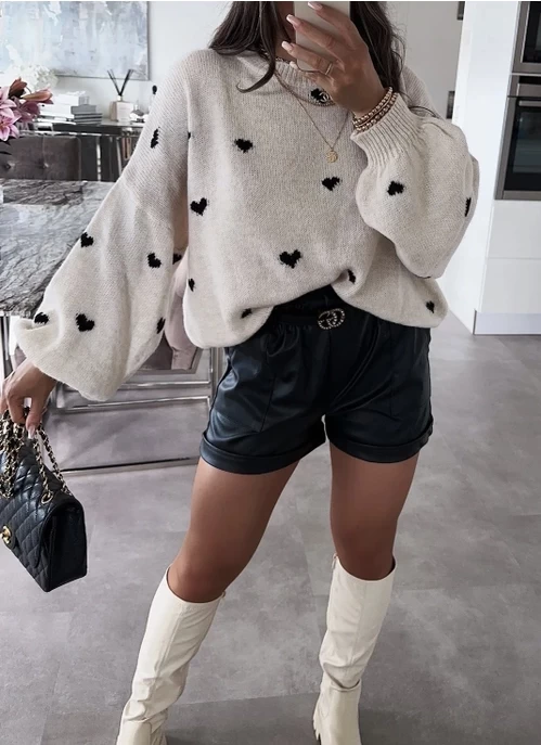 Knitted sweater with heart pattern, round neck sweater. The knit top is one size fits all.