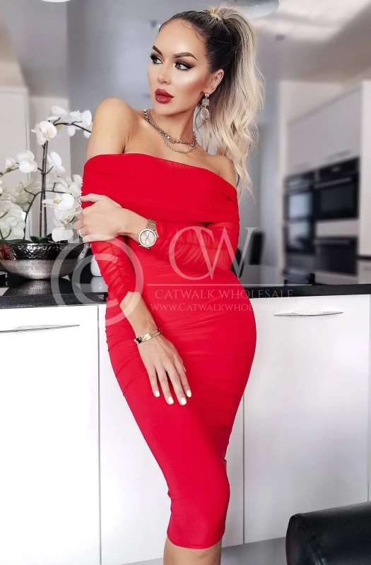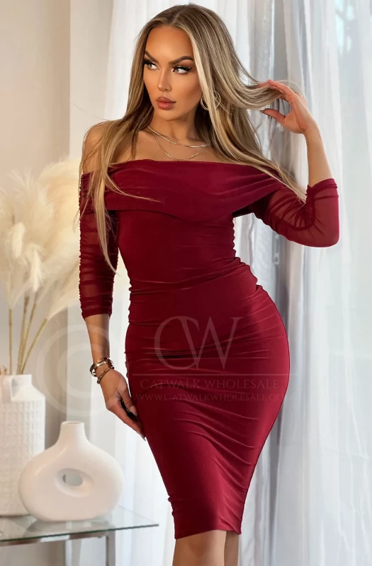 Bardot neckline with delicate ruched mesh insert detail