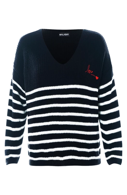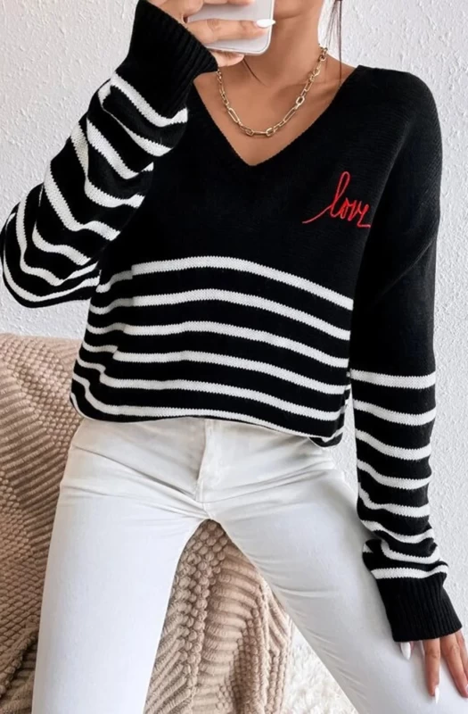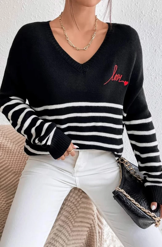 This trendy, casual-day-wear knitted jumper top features an all-over striped pattern, long sleeves, and a V-cut neckline decorated with a "LOVE" heart print. Crafted with the utmost care from soft and flexible fabric, this item is available in sizes S/M (UK 8/10) and M/L (UK 12/14).