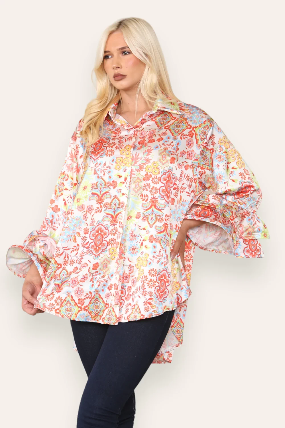 PUFF SLEEVE PRINTED SATIN SHIRT
