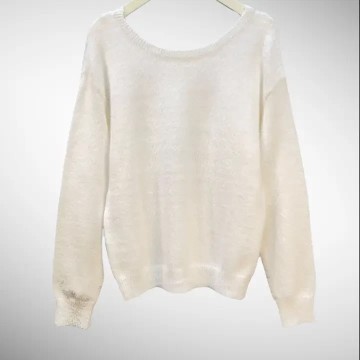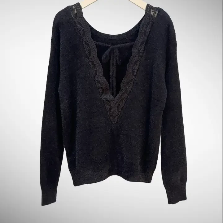 This elegant sweater features an open back with a neckline adorned with delicate lace and a bow at the back. Perfect for a refined and alluring look at parties or special occasions.