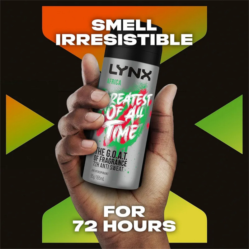 Lynx Africa The G.O.A.T of Fragrance 72Hr Anti Sweat Anti-Perspirant Deodorant Spray 150ml delivers powerful protection with the iconic Lynx Africa scent. It provides up to 72 hours of anti-sweat and odour protection to keep you feeling confident for longer. The bold fragrance blends warm African spices with hints of mandarin and sandalwood. Designed for men who want long-lasting freshness with attitude. The advanced anti-perspirant formula helps control sweat effectively. It keeps underarms dry even during busy or active days. The spray applies evenly for full coverage and reliable performance. It dries quickly without leaving sticky residue. Suitable for everyday wear, workouts, and long days out. The fragrance stays noticeable without being overpowering. Dermatologically tested for skin comfort and safety. The compact 150ml size is perfect for gym bags or travel. Ideal for men who want standout scent and strength. Combines iconic Lynx fragrance with serious protection. Lynx Africa G.O.A.T keeps you fresh, dry, and smelling great all day and beyond.