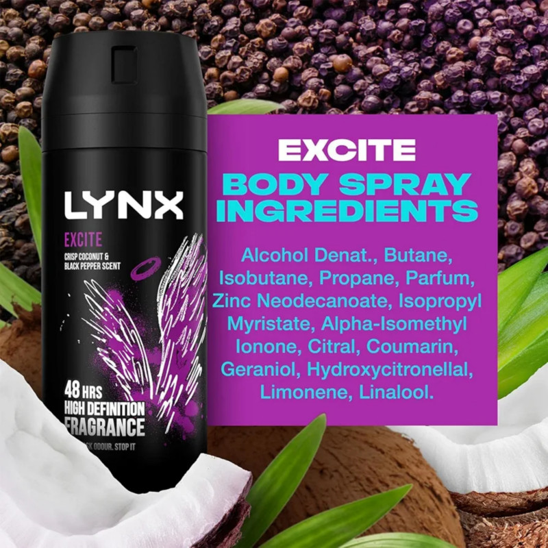 Lynx Excite Deodorant Body Spray with Crisp Coconut and Black Pepper Scent delivers a bold and irresistible fragrance experience. This deodorant blends smooth coconut sweetness with a spicy kick of black pepper for a unique, modern aroma. It provides long-lasting freshness that keeps you feeling confident throughout the day. The lightweight spray dries quickly without leaving sticky residue. Designed for everyday use, it helps control body odor effectively. The energising scent is perfect for both casual and evening wear. Its refreshing formula keeps you feeling clean and revitalised. Easy-to-use aerosol spray ensures even coverage with every application. Suitable for all skin types when used as directed. The fragrance is masculine, warm, and subtly seductive. Ideal for men who enjoy standout scents with personality. The compact 150ml size is great for home, gym, or travel. Keeps you smelling fresh and confident in any situation. Lynx Excite is known for its iconic, crowd-pleasing fragrance. This deodorant adds a confident finishing touch to your daily grooming routine.