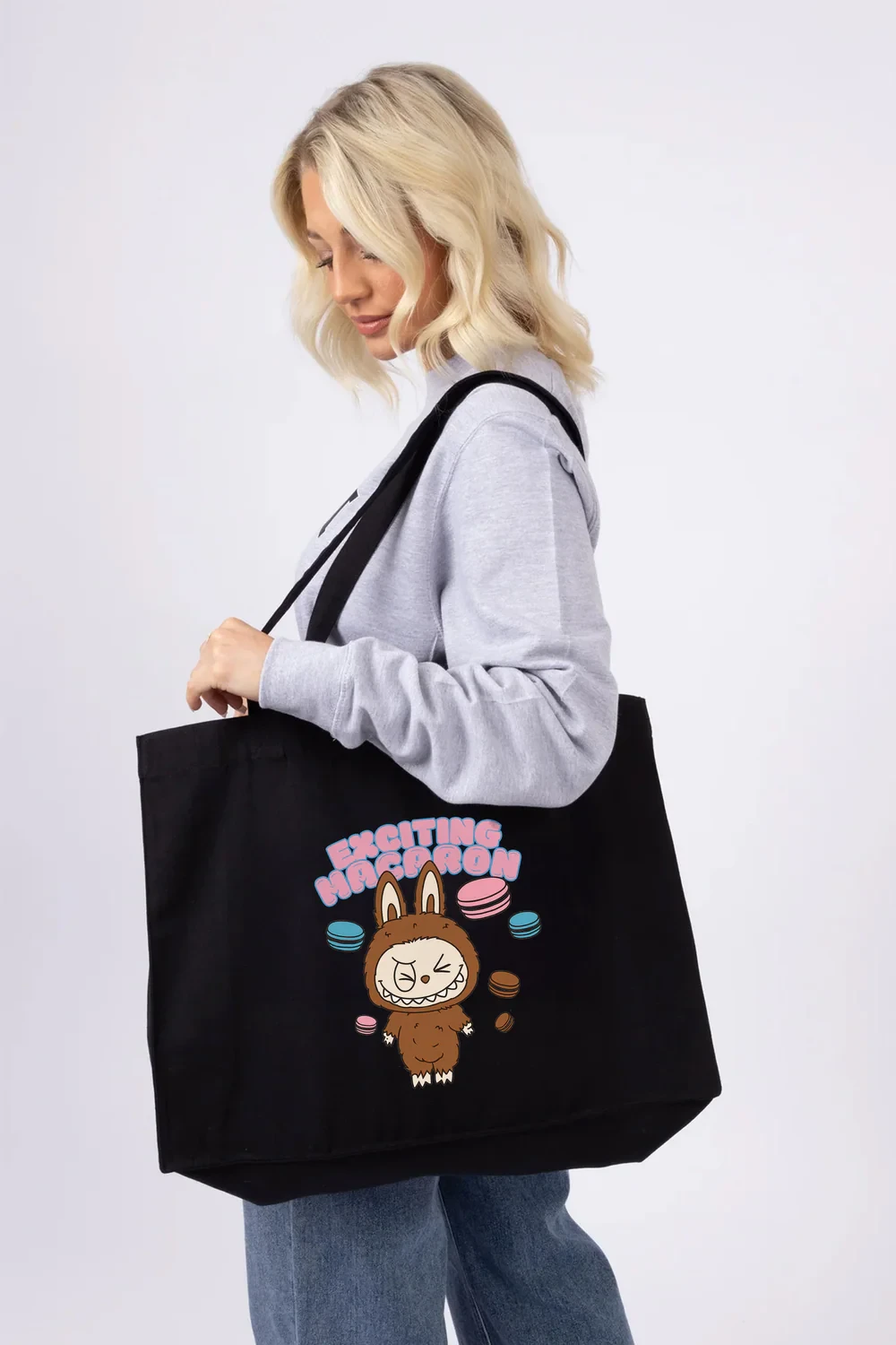 Sweeten up your Spring/Summer edit with the playful charm of our Macaron Labubu tote bag, featuring the cheeky character surrounded by colourful treats. Available in two fun-loving base colourways – black and natural. Crafted from lightweight cotton, it’s reusable, sustainable, and ideal for everyday adventures. Designed with shoulder-length handles and a roomy interior to carry all your essentials. A bold, eco-friendly statement piece blending character-driven graphics with practical design.