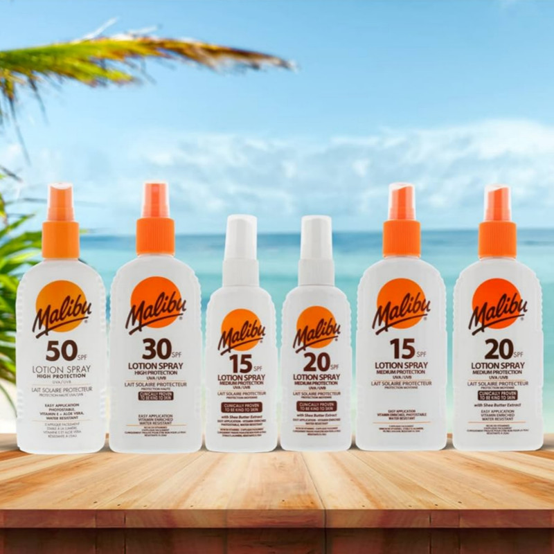 The Malibu Sun Lotion Spray 30 SPF UVA/UVB High Protection 200ml provides a high level of protection against both harmful UVA and UVB rays, helping to prevent sunburn and long-term sun-induced skin damage. The formula is clinically proven to be gentle on the skin, suitable for all skin types, and is also water-resistant, making it ideal for use during swimming or sweating. Enriched with beneficial vitamins, specifically Vitamin E and Pro Vitamin B5 (Panthenol), along with soothing Aloe Vera extract, the lotion helps to nourish, hydrate, and restore the skin's natural moisture levels, leaving it feeling soft and healthy. Its non-greasy formula absorbs quickly into the skin without leaving a sticky or white residue, which users often praise in reviews. The convenient spray application method allows for quick, hassle-free coverage, even on hard-to-reach areas, ensuring all exposed skin is evenly and generously covered. Proudly made in England, this sun lotion is vegan-friendly and is only ever tested on humans. For optimal efficacy, it should be applied liberally approximately 30 minutes before sun exposure and reapplied frequently, especially after toweling, swimming, or sweating.