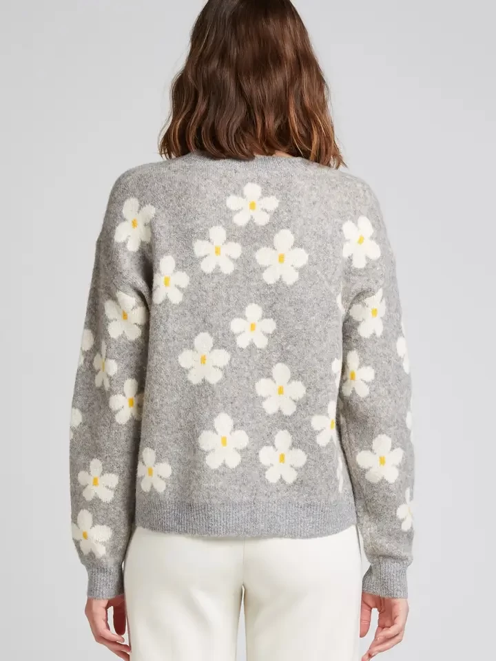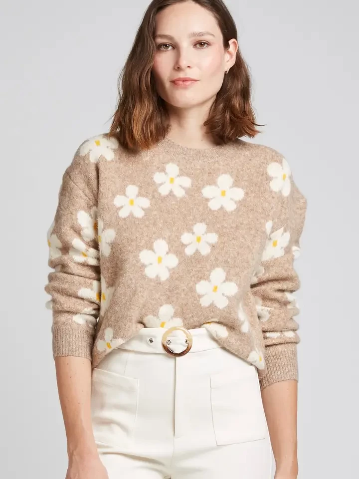 This floral wool blend sweater offers softness and comfort. Composed of 40% viscose, 30% acrylic, 27% wool and 3% elastane, it is available in gray and taupe for an elegant and warm look.