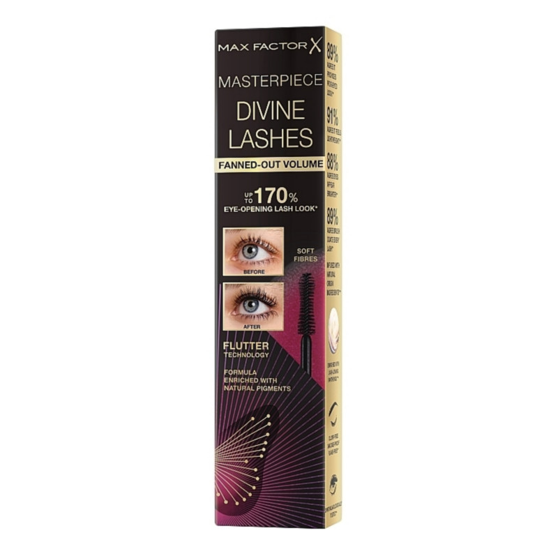 Max Factor Divine Lashes Fanned Out Volume Mascara in Rich Black creates elegantly lifted, fuller lashes with a soft, feathered finish. The intensely pigmented Rich Black shade enhances lash definition for a bold yet refined look that suits any occasion.