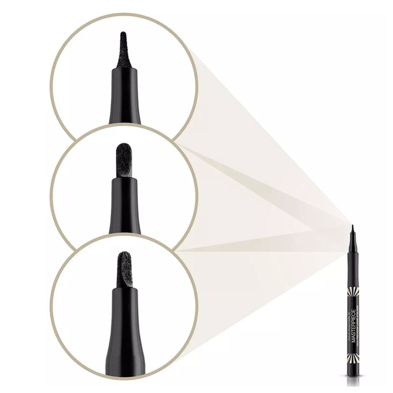 Max Factor Masterpiece High Precision Liquid Eyeliner in 01 Velvet Black offers intense definition with sleek, high-impact color. Designed for precision and control, it features a unique paddle-shaped tip for versatile looks—from ultra-thin lines to bold, dramatic flicks. The rich velvet-black pigment delivers deep, saturated color in just one stroke.
