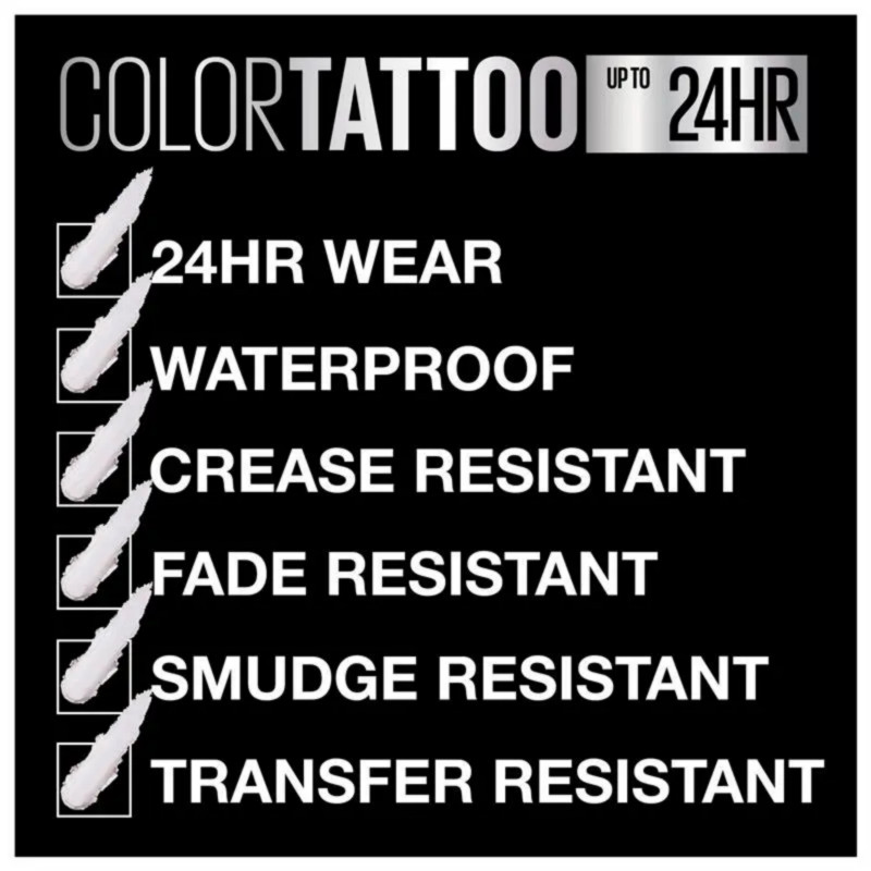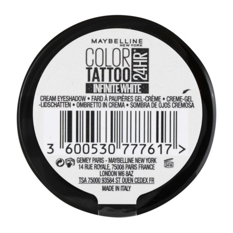 The Maybelline 24HR Color Tattoo Eyeshadow - 45 Infinite White is an iconic cream-gel eyeshadow in a versatile, vibrant white shade, known for its long-lasting, high-impact color payoff. Utilizing Maybelline's innovative "ink technology," the formula boasts up to 24-hour staying power with intense color saturation that resists fading, creasing, and smudging. The unique gel-cream consistency is ultra-smooth and seamlessly melts onto eyelids in one easy swipe, ensuring a flawless look all day and night. It has a silky, shimmering finish, which makes it a perfect, multi-use product: wear it alone for an icy, eye-brightening effect, use it as a base or primer to enhance other powder eyeshadows, or apply it to the inner corners for a striking highlight. The waterproof and smudge-resistant formula is designed to withstand humidity, sweat, and physical activity, making it a reliable choice for any occasion. Ophthalmologist and dermatologist tested, it is suitable for sensitive eyes and contact lens wearers, providing intense, durable color you can "set and forget". Reviewers often praise its smooth application, excellent coverage, and the fact that a little product goes a long way.