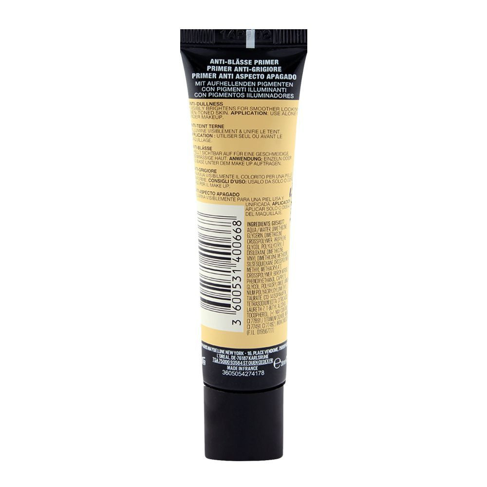 Maybelline Master/Face Studio Prime Anti‑Dullness Primer – 40 Anti‑Dullness is a lightweight, mattifying primer designed to revive lacklustre skin and create a smooth, radiant base for flawless makeup application. Its advanced formula helps reduce the appearance of dullness and uneven texture while enhancing the skin’s natural glow. The soft, silky texture glides easily onto the skin and smooths away the look of fine lines, pores, and rough patches, helping makeup apply more evenly and last longer. Infused with brightening agents and hydrating ingredients, this primer boosts radiance while keeping the skin feeling comfortable throughout the day. The subtle anti‑dullness tint helps neutralise grey undertones and gives the complexion a fresh, luminous look. Its lightweight, non‑greasy consistency absorbs quickly without clogging pores, making it suitable for most skin types including normal, combination, and dry skin. Designed to work under foundation or on bare skin, it enhances overall makeup performance and helps maintain a balanced, healthy appearance. The primer’s long‑lasting formula keeps makeup looking vibrant and smooth from morning to evening. Compact and travel‑friendly packaging makes it convenient for daily use and on‑the‑go touch‑ups. Ideal for anyone seeking to brighten dull skin and create a polished makeup base with a soft, natural glow. Maybelline Master/Face Studio Prime Anti‑Dullness Primer – 40 Anti‑Dullness combines hydration, radiance enhancement, and long‑lasting smoothness in one essential product. ✨