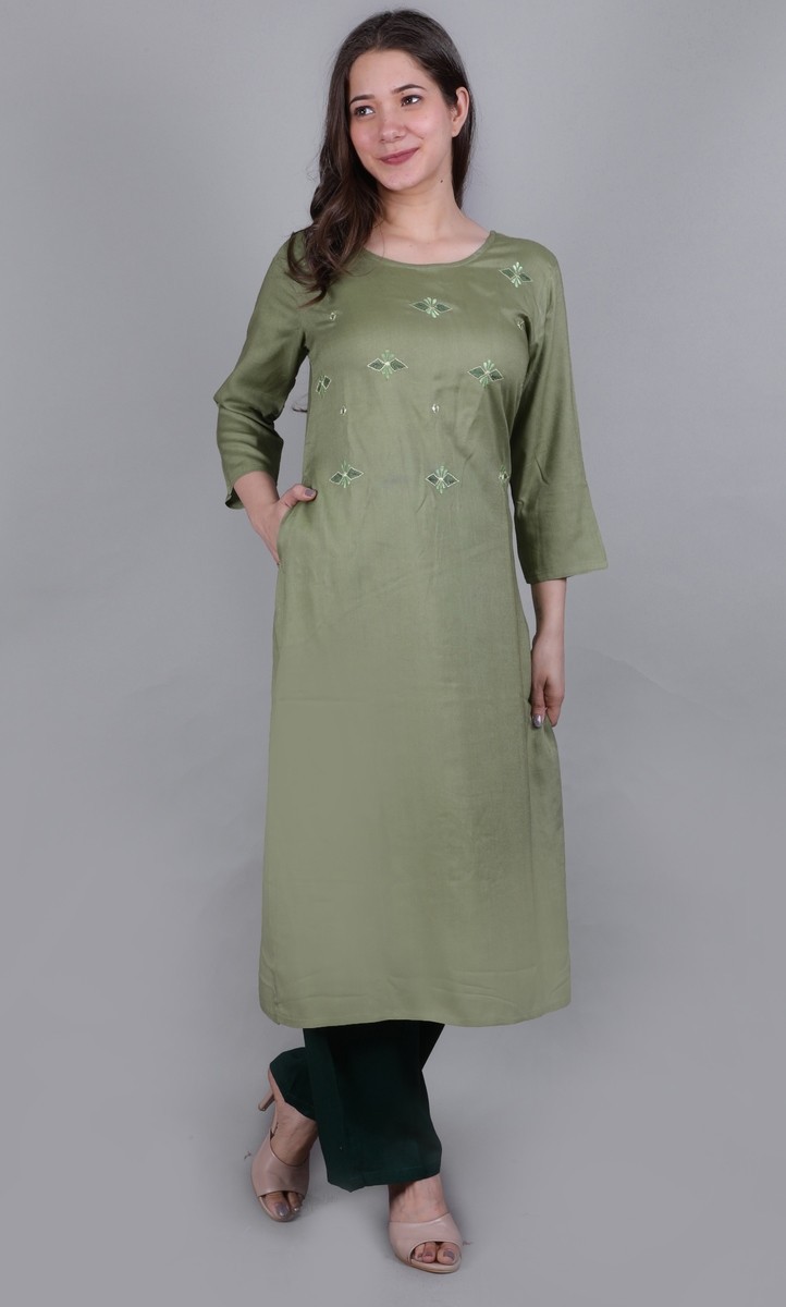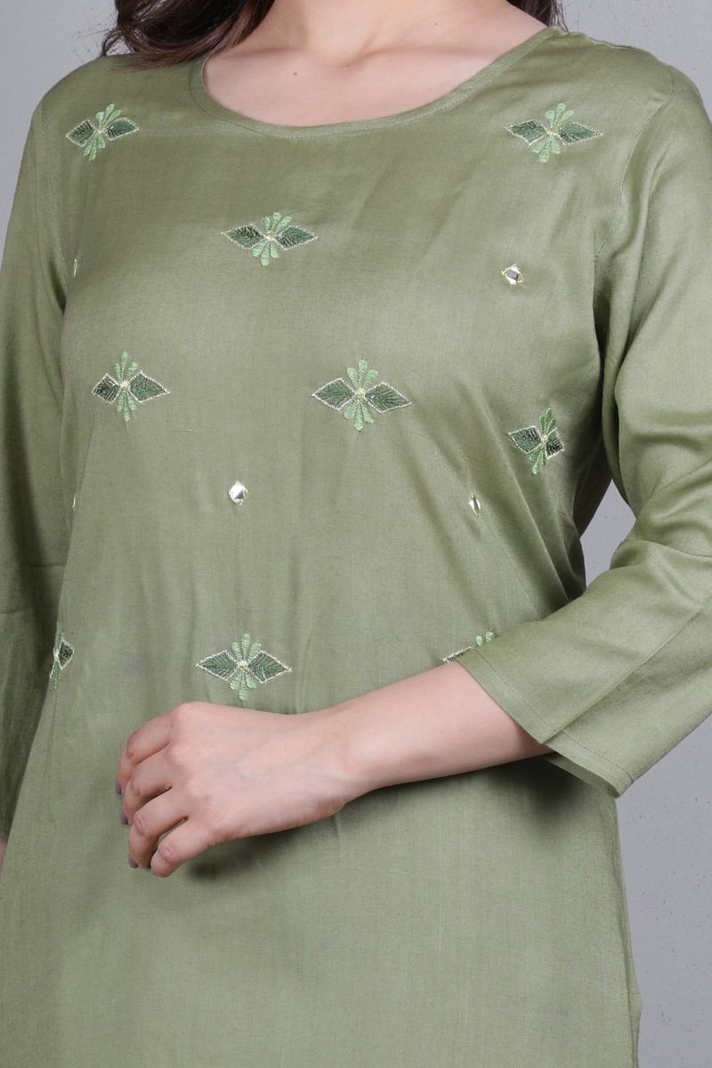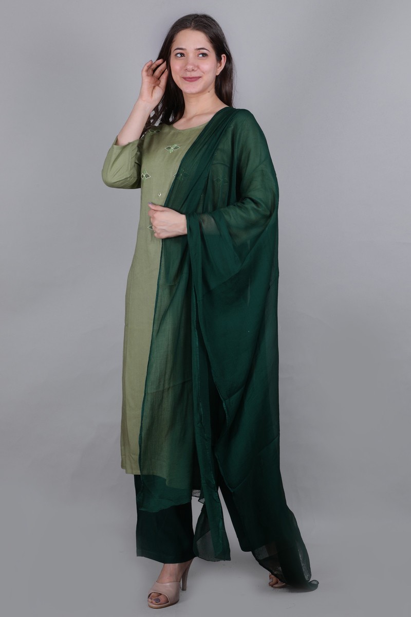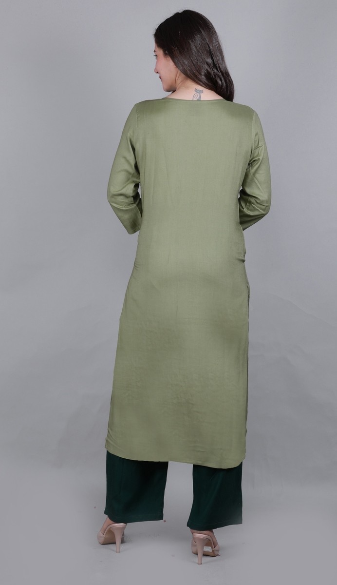 Rayon Embroidered Kurti With Plazzo Pant & Dupatta Set. Round Neck. 3/4 Sleeve. Paired With Contrast Plazzo Pant. All Round Elastic. Chiffon Dupatta., Interlocking-Same Thread, Color Will Not Bleed, Will Not Shrink, Handwash,Separately