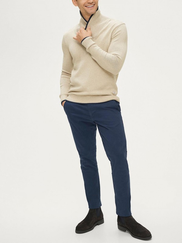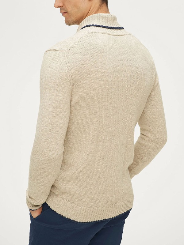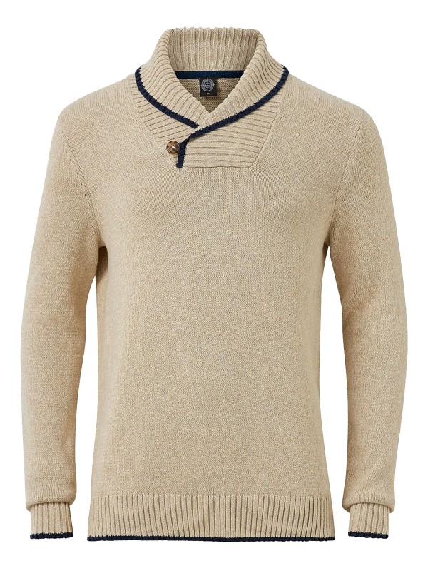 Knitted sweater Galvin from On Our Terms in melange cotton. Ribbed shawl collar that is wrapped with a button at the front. Ribbed cuffs at cuffs and bottom. Length approx. 71cm in size M.