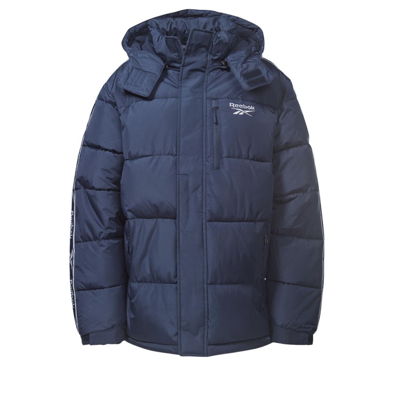 Men’s Reebok ‘Puffer’ jacket. Features a Reebok logo on the front chest and down each sleeve. Also includes two front pockets and a hood.