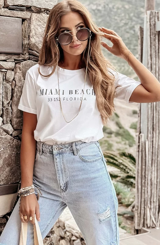 Experience the ultimate summer look with our 'Miami Beach-33152 Florida' Graphic Printed T-Shirt Top, perfect for casual wear. This top features a trendy front graphic print and a comfortable crew neckline with short sleeves. Its soft and stretchy fabric is perfect for all-day wear. Available in approx. sizes of: One Size (UK 8-12 - fits between size 8 up to size 12) and an approx. length of: 25"(64cm). Made in Italy from 100% Cotton, ensuring high quality and style. Don't miss out on this must-have addition to your summer wardrobe!