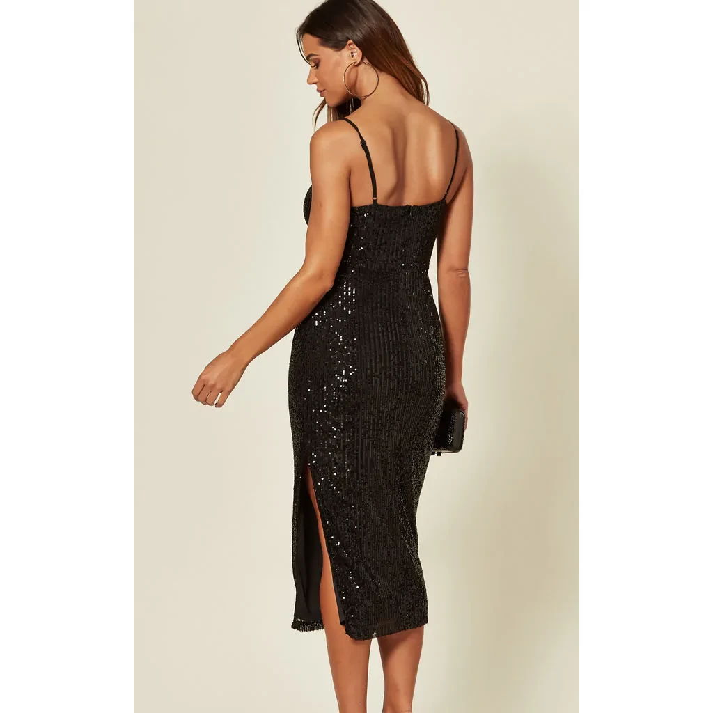 Black all-over sequin, stretch midi dress with side slit perfect for a formal event, dinner or party. This dress is classy and elegant.