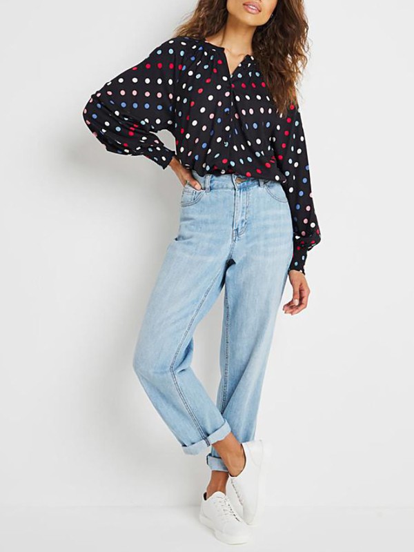 Update your wardrobe with this gorgeous multi spot blouse. In the best selling collarless shape with shirred cuff detailing in a beautiful, bold color. Perfect for any occasion. Length 31in.