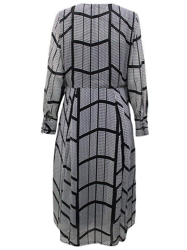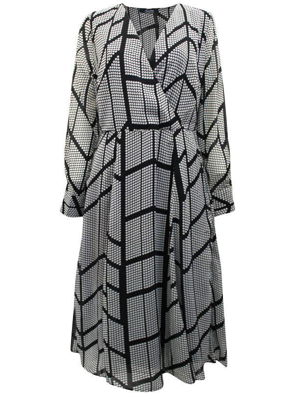 Made from a printed woven fabric, this dress features a mock wrap design, long sleeves with button cuffs and finishes in a midi length. Length 47in.
