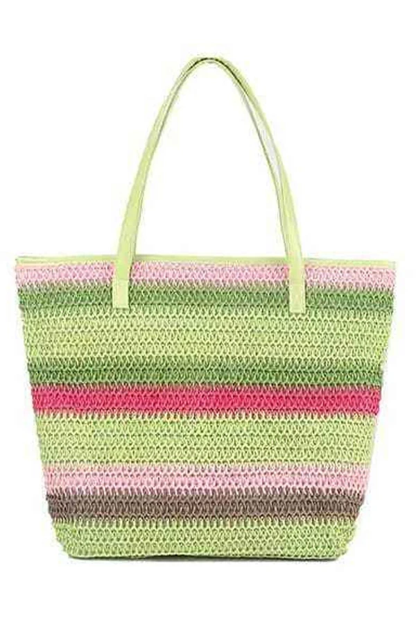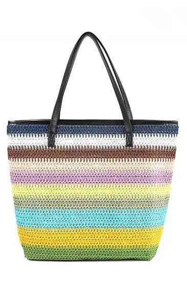 Brighten up your summer outings with this eye-catching Multicolor Woven Stripe Beach Tote Bag. Designed to combine fun, functionality, and style, this bag features vibrant horizontal stripes in a rainbow of colors that evoke the carefree spirit of sunny days. The textured woven design gives it a charming handcrafted look, while the black faux leather handles add a touch of sophistication and durability. Spacious enough to carry your beach essentials, shopping finds, or daily must-haves, this tote is perfect for casual outings, vacations, or day trips. Its lightweight construction and roomy interior make it a practical choice without sacrificing style. Whether you're headed to the seaside or strolling through the market, this colorful tote bag is the perfect companion for your seasonal adventures.Brighten up your summer outings with this eye-catching Multicolor Woven Stripe Beach Tote Bag. Designed to combine fun, functionality, and style, this bag features vibrant horizontal stripes in a rainbow of colors that evoke the carefree spirit of sunny days. The textured woven design gives it a charming handcrafted look, while the black faux leather handles add a touch of sophistication and durability. Spacious enough to carry your beach essentials, shopping finds, or daily must-haves, this tote is perfect for casual outings, vacations, or day trips. Its lightweight construction and roomy interior make it a practical choice without sacrificing style. Whether you're headed to the seas