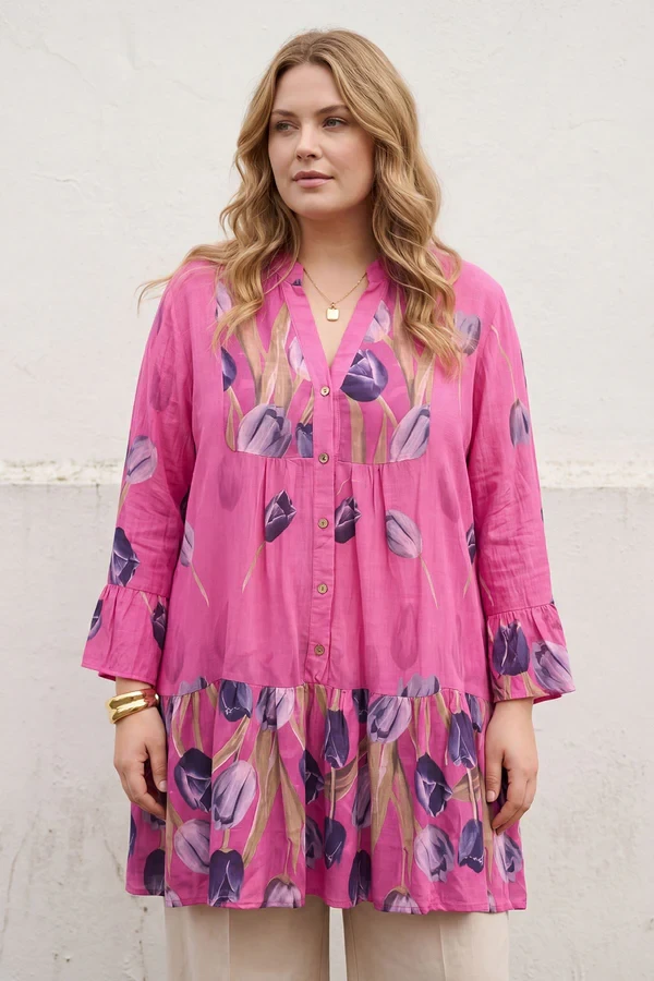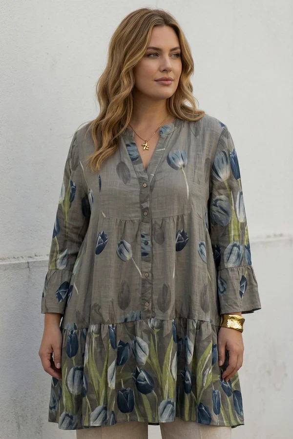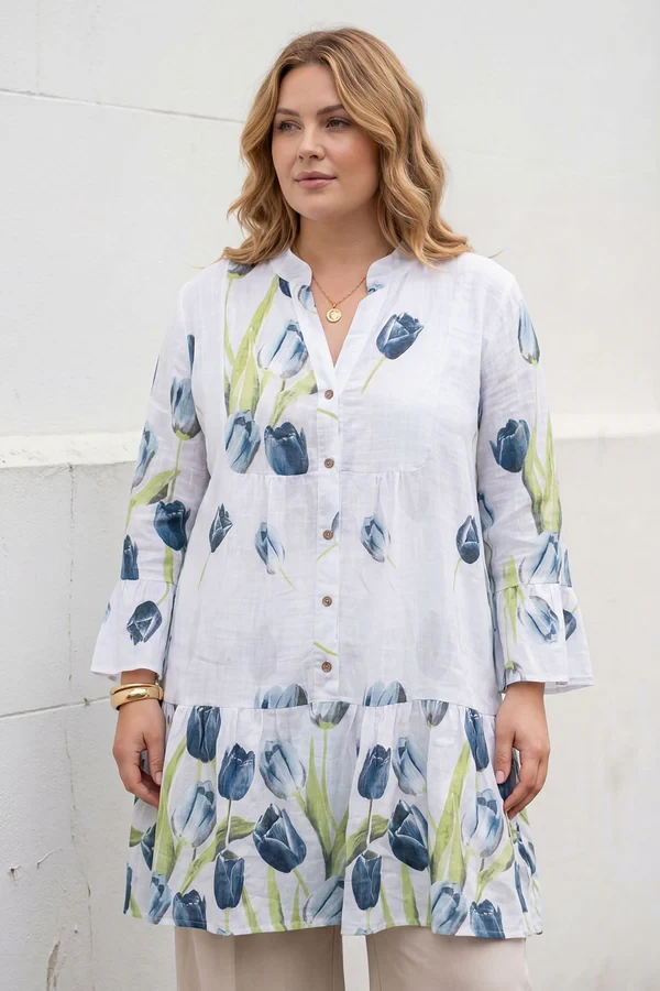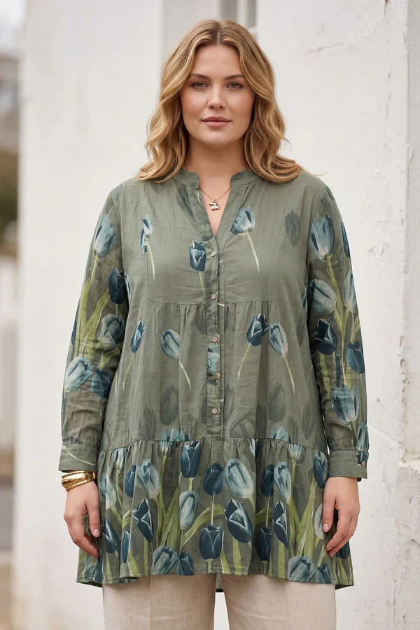 Refresh your seasonal wardrobe with this beautifully crafted Italian cotton tulip flower print shirt, designed for effortless everyday elegance. Made from lightweight, breathable cotton, this stylish piece features a soft slightly crinkled natural texture that adds relaxed charm and comfort. The mandarin collar/band collar gives it a polished yet casual touch, while the front button-up fastening allows versatile styling. Designed with long sleeves that can be rolled up, this shirt is perfect for transitioning through spring, summer, and autumn. The buttoned cuffs provide a neat finish, while the hip-length cut makes it easy to wear tucked in or loose. With its plus size, loose fit silhouette, this shirt offers flattering comfort without compromising style. Ideal for layering over camisoles or under jackets, it’s a must-have for casual chic dressing.