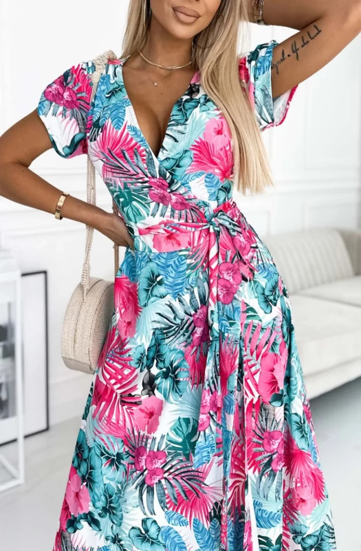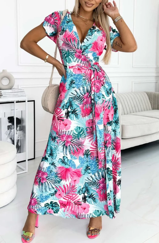 Low cut open front wrap 'V' neckline with elasticated waistband