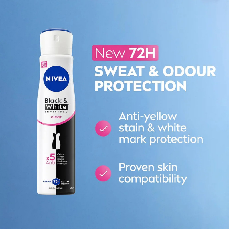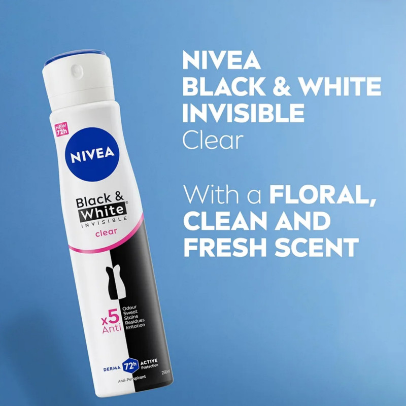 Nivea Black and White Invisible Clear Anti-Perspirant Deodorant Body Spray 250ml delivers powerful protection while keeping your clothes stain-free. Its advanced formula provides up to 48 hours of reliable anti-perspirant protection against sweat and odor. Specially designed to prevent white marks on black clothing and yellow stains on white fabrics. The clear formula dries quickly without leaving residue. Leaves underarms feeling fresh, clean, and comfortable all day long. Infused with a light, refreshing fragrance for long-lasting confidence. Gentle on skin and suitable for everyday use. Dermatologically tested for skin compatibility. Alcohol-free to help reduce the risk of irritation. Ideal for all skin types, including sensitive skin. Provides a smooth, non-sticky feel after application. Perfect for active and busy lifestyles. Easy spray application ensures even coverage. Helps you stay fresh and confident in any outfit. Nivea Black and White Invisible Clear combines strong protection with care for your clothes and skin.